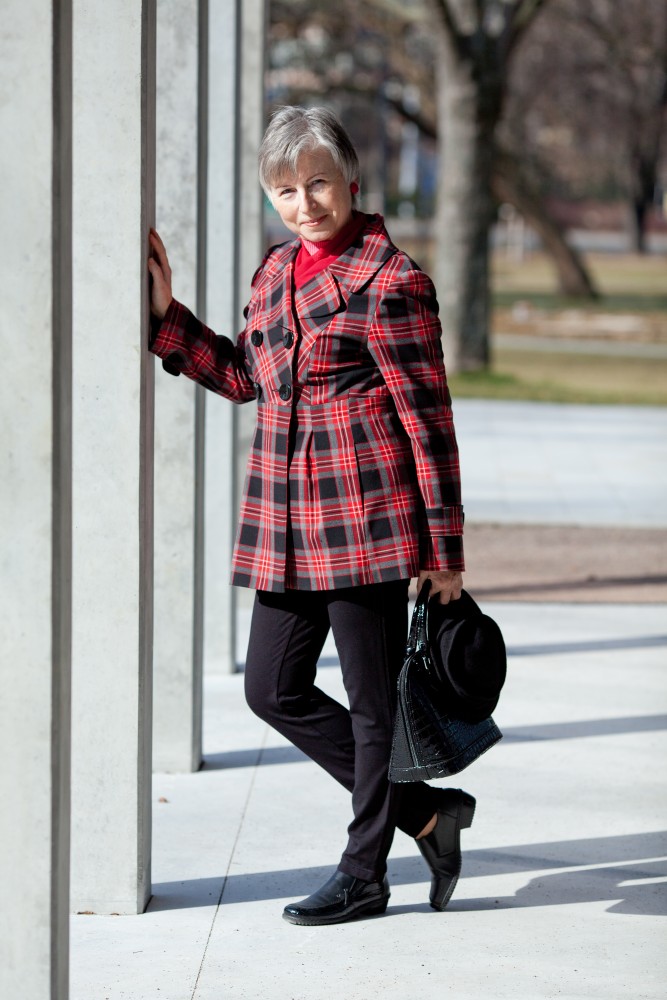 Hana je další žena, která mi udělala radost. Líbí se mi sladění barev, nic není přehnané, rušivé. Dobře ví, že když má výrazný kabátek, je nejlepší doplnit ho jednou barvou, zkrátka, že méně je více. Mám pocit, že si také dobře uvědomuje, že tyto barvy a styl sedí k jejímu šedému tónu vlasů, který také svědčí o sebejistotě. Pro mě je toto ukázka, že žena může mít pohodlné oblečení a boty, ve kterých se dá vyrazit na velkou procházku a přitom nevypadat jako horolezec. Dáma, která má ráda sport, pohodlí, přírodu, ale zůstává dámou.