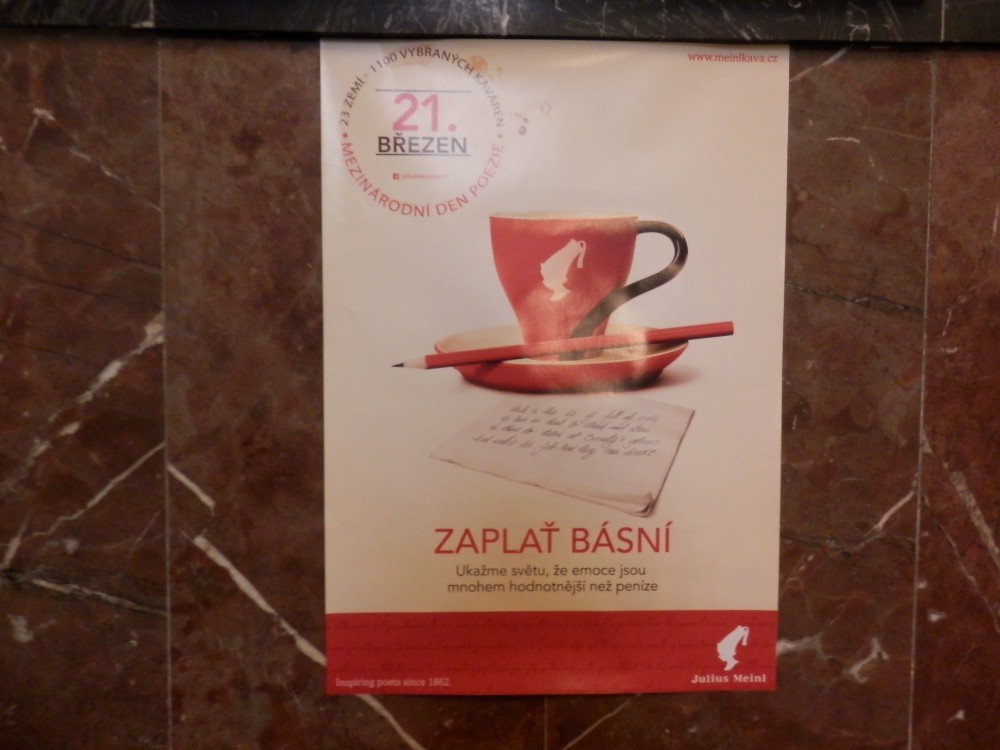 Když jsem si na i60 přečetla informaci o Dni poezie, v němž bude možno zaplatit kávu básničkou, samozřejmě se mě začala zmocňovat zvědavost. A když jsem zjistila, že se k této mezinárodní akci, jejíž snahou je navrátit do všedního života trochu poezie, přihlásila i má oblíbená kavárna Café Louvre na Národní třídě, bylo rozhodnuto, že se tam vydám. Do kavárny jsem chodila ještě do loňského roku na pravidelné konverzační schůzky s německým studentem a moc se mi stylově líbí.
