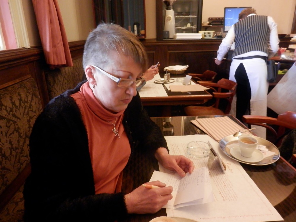Redaktorka mizí, obsluha přináší kávu, na dva malé lístečky píšu dvě nepříliš dlouhé básničky, jimiž platím své kapučíno a Marcelino presso. Básničky všech zúčastněných prý budou zveřejněny na Facebooku Café Louvre a možná i někde uvnitř v kavárně. O osudu rozhovoru pro Český rozhlas však nic nevím, zapomněla jsem se zeptat.