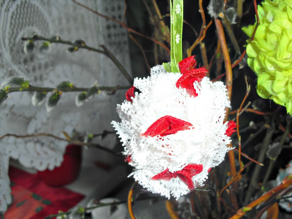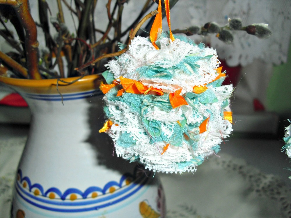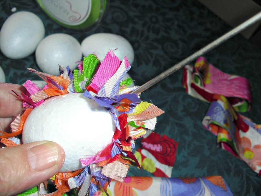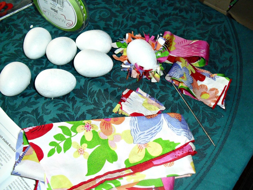 Z látky si nastříháme čtverečky nebo kolečka a tenkou jehlicí nebo háčkem je postupně zapichujeme do polystyrenového vajíčka. Nakonec na vrch střapatého vajíčka jednoduše zapíchneme kousek stuhy a navěsíme na kroucenou vrbu nebo kočičky (viz foto).