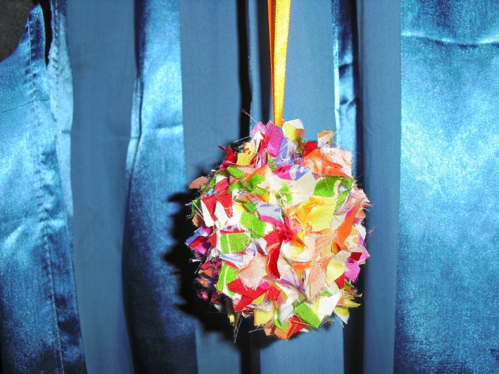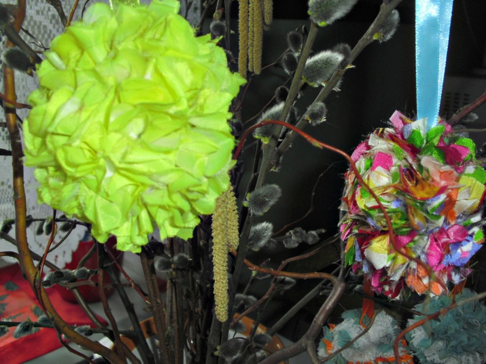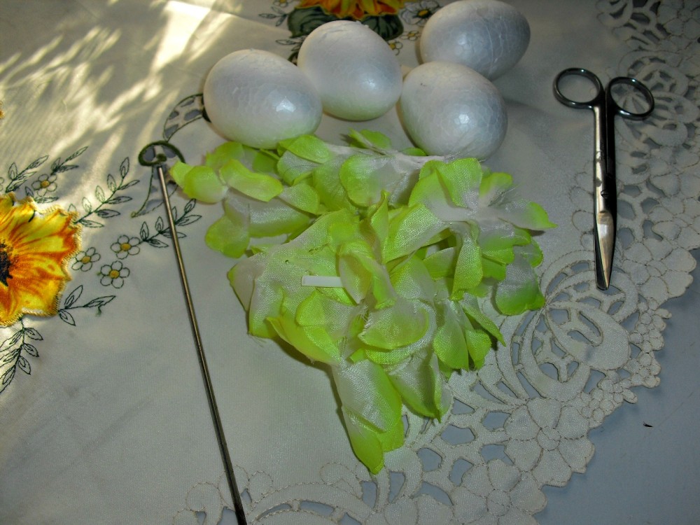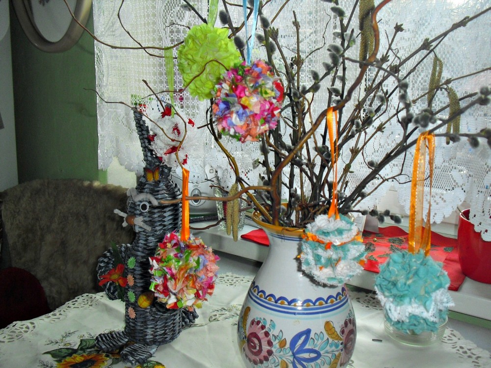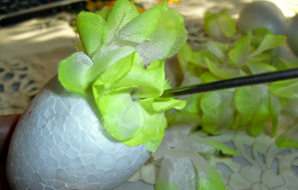 Z látky si nastříháme čtverečky nebo kolečka a tenkou jehlicí nebo háčkem je postupně zapichujeme do polystyrenového vajíčka. Nakonec na vrch střapatého vajíčka jednoduše zapíchneme kousek stuhy a navěsíme na kroucenou vrbu nebo kočičky (viz foto).
