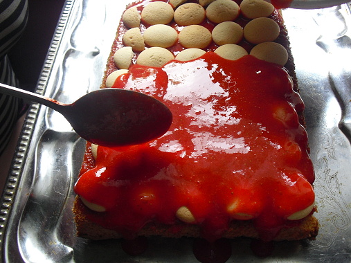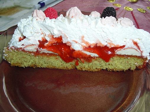 Ušleháme piškotové těsto, nalejeme na plech vyložený pečícím papírem a pak pečeme do zlatova. Korpus jsem potřela rozšlehanými jahodami, do kterých jsem přidala meruňkovou marmeládu. Dala vrstvu piškotů a na ně zbytek jahodového pyré.