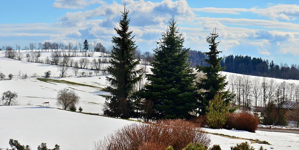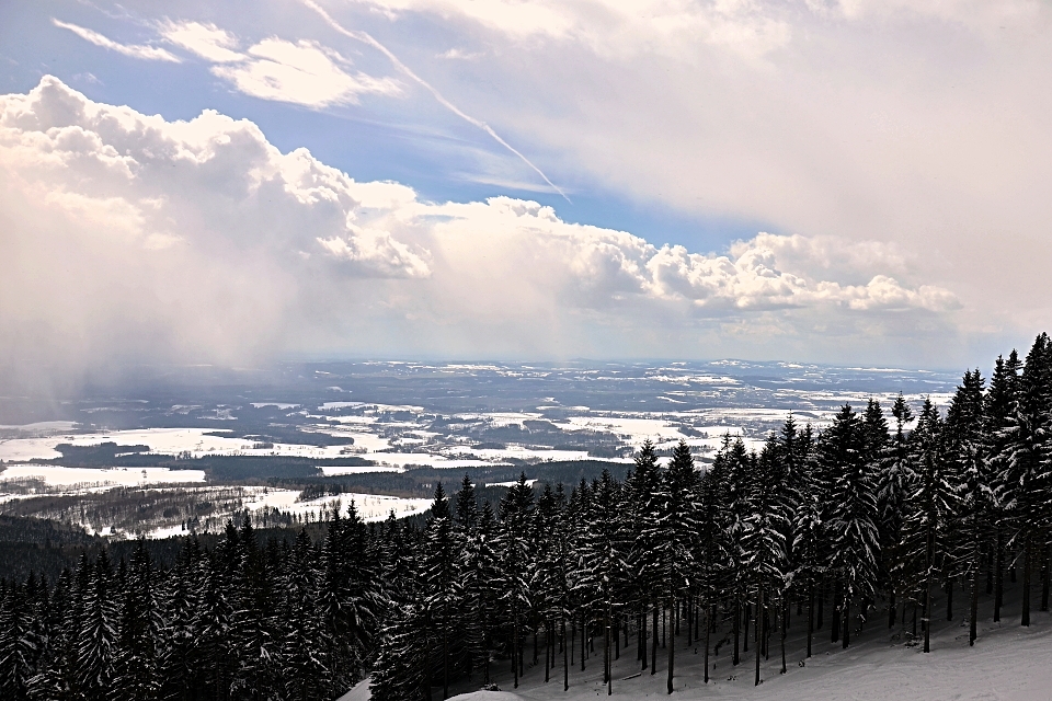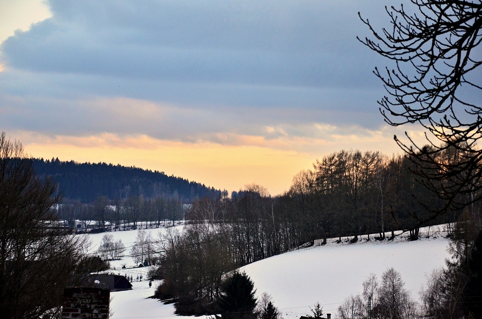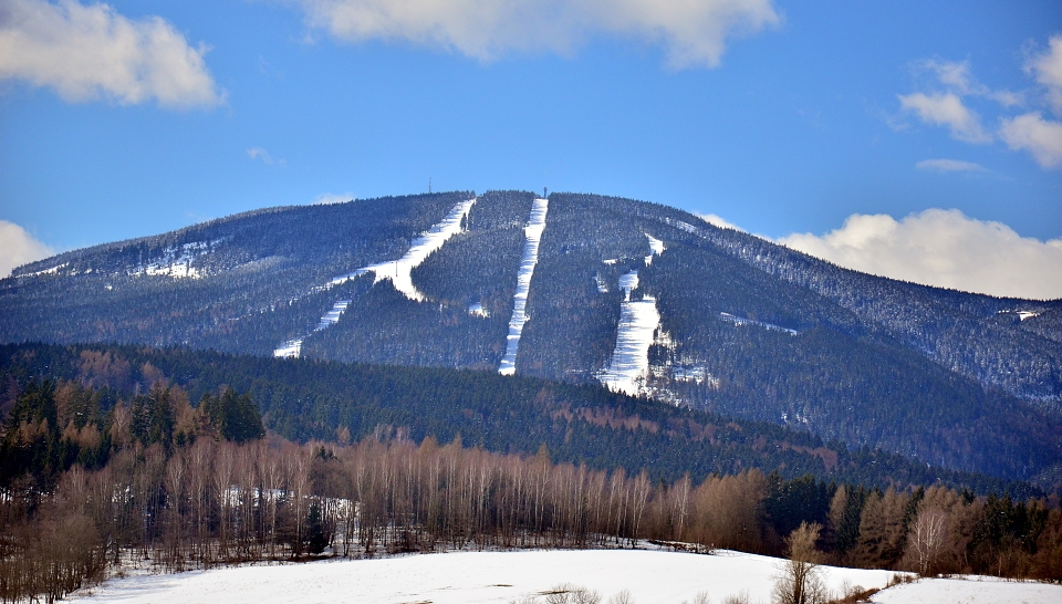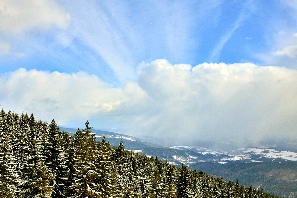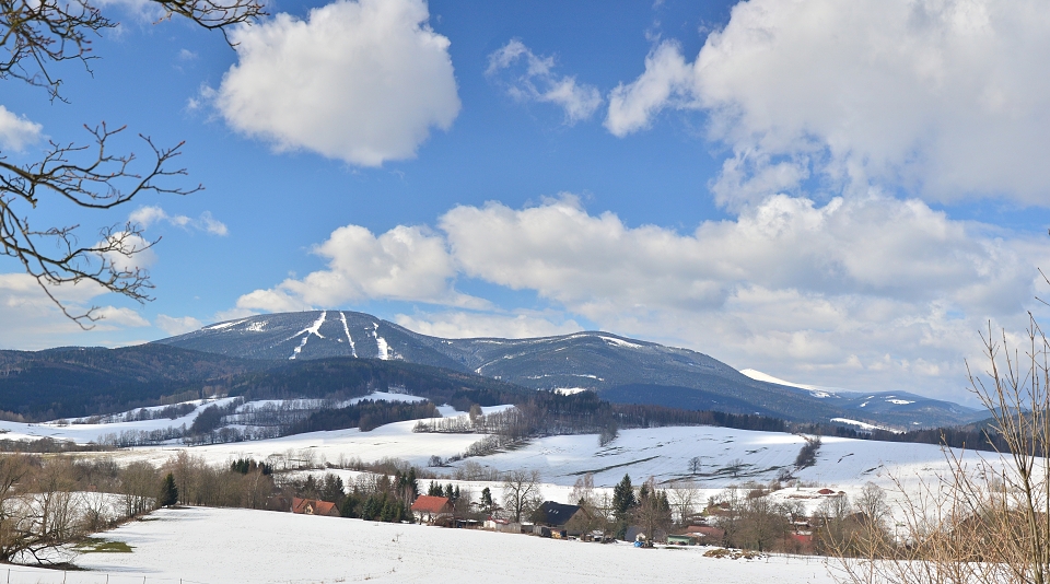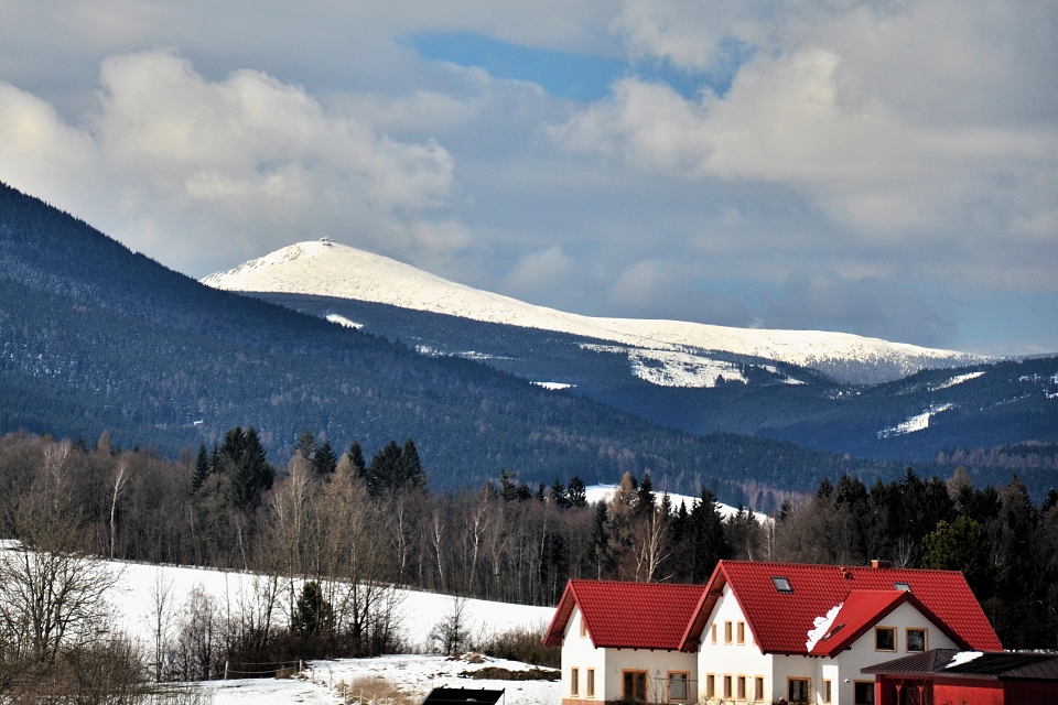 Cestou zpět jsme potkali rodinnou „jízdní kavalerii“ a vyjeli na vrchol stoupání silnice. Nádherný výhled na sluncem ozářenou Černou horu nás donutil vystoupit a kochat se, a kochat se, a … taky fotit. Ještě jsme dojeli k budově golfového hřiště, odkud se nám otevřel pohled vpravo od Černé hory na sluncem zalitou zasněženou Sněžku. V takové chvíli si říkám: „Čert vem Turecko, Maledivy nebo Kanáry. Doma je krásně.“