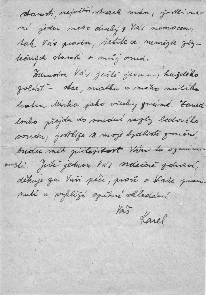Moje babička si čte poslední dopis od svého staršího syna. Končí slovy... „V táboře je vyhlášena karanténa, ale nestrachujte se, prodělal jsem protityfovou kúru. Těším se na brzkou shledanou, váš Karel.“