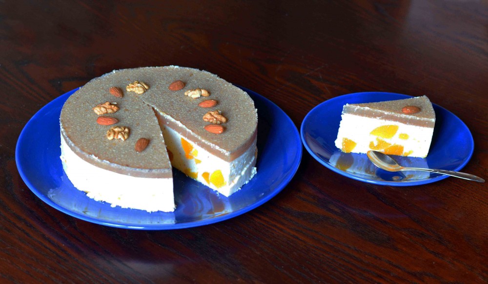 Tvaroh jsem ve větší misce rozmíchal s kefírem, šťávou z celého citronu, trochou šťávy z kompotů, medem a skořicí. Meruňkový a broskvový kompot jsem procedil a ovoce nasekal na malé kousky a vmíchal do tvarohové hmoty. Želatinu jsem zvolil živočišnou, čistou vepřovou, bez chemických látek. Chtěl jsem raději použít přírodní a hledal informace, je-li přírodní lepší. Kupodivu není, alespoň ty, co jsou běžně dostupné obsahují košenilu, kyselinu karmínovou, a ta je fuuuj... A v té živočišné je kolagen, a ten je hodně nutný... No co se dá dělat, vegetariánský dort to není. Tak jsem tedy připravil želatinu (dle uváděného návodu na obalu) a teplou ji vmíchal do tvarohového těsta. Vše dobře prohnětl a nalil do dortové misky. Kakaovým práškem udělal srdíčko na povrchu a šup se vším na 30 minut do mrazáku. Ztuhlo to dokonale a hned se dalo papat, ještě dozdobené rozmraženými jahůdkami. A řeknu vám, že tenhle dortík je návykový... A může mít mnoho variant, třeba s povrchem z mletých oříšků nebo čokolády, nebo si umím představit další želatinovou vrstvu s čerstvými jahodami. Fantazii se meze nekladou.