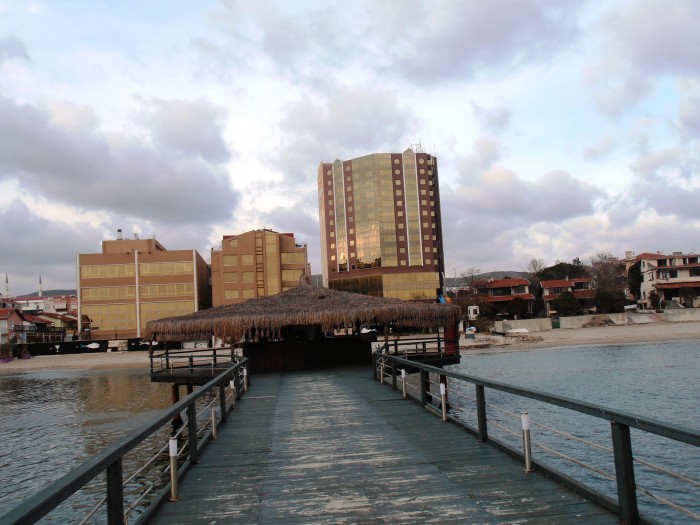 Po hodině a půl autobus zastavuje. Před námi 5hvězdičkový hotel ARTEMIS PRINCESS. Vystupujeme z autobusu, bereme si svá zavazadla a jdeme do recepce. Neuvěřitelné množství lidí. Dostáváme kartu a jdeme se ubytovat. Turek se koukne na číslo mého pokoje, ukazuje, že budeme v druhém podlaží. Asi 20 schodů. Výtahem? Ne. Prý pěšky. Koukám na něho, na svůj kufr a opět zvedám oči směrem ke snědému muži. Bere mi kufr z ruky a vynáší ho po schodech nahoru. Jen zírám. Mohu to udělat sama, nebo třeba manžel, ale třeba to má v náplni práce. (NE NE NE – jsou zvyklí na bakšiš). Děkuji a vcházíme do svého pokoje. Pěkný, prostorný, s hezkým nábytkem, televizí, soc.zařízením. Ale je zde velká zima. Rychle zavíráme okna. Snad tu bude brzy příjemně teplo. Venku je 7°C. Z okna vidíme přímo do hotelové jídelny. Jdu zjistit, jaký je výhled z dalších přístupných oken. Jediné je na chodbě. A za ním obrovské překvapení. Pár metrů od budovy se rozprostírá Marmarnské moře. Smiřuji se s faktem, že je březen a koupat se tady ještě opravdu dlouho nebude moci. V pokoji je pořád zima, jdu raději ven na malou obchůzku. Manžel odmítá. Sedá v bundě na sobě a s kapucí na hlavě do křesla a pevně věří tomu, že se někde s někým domluvím a ten někdo nám něco s topením udělá. Nám se to nedaří.