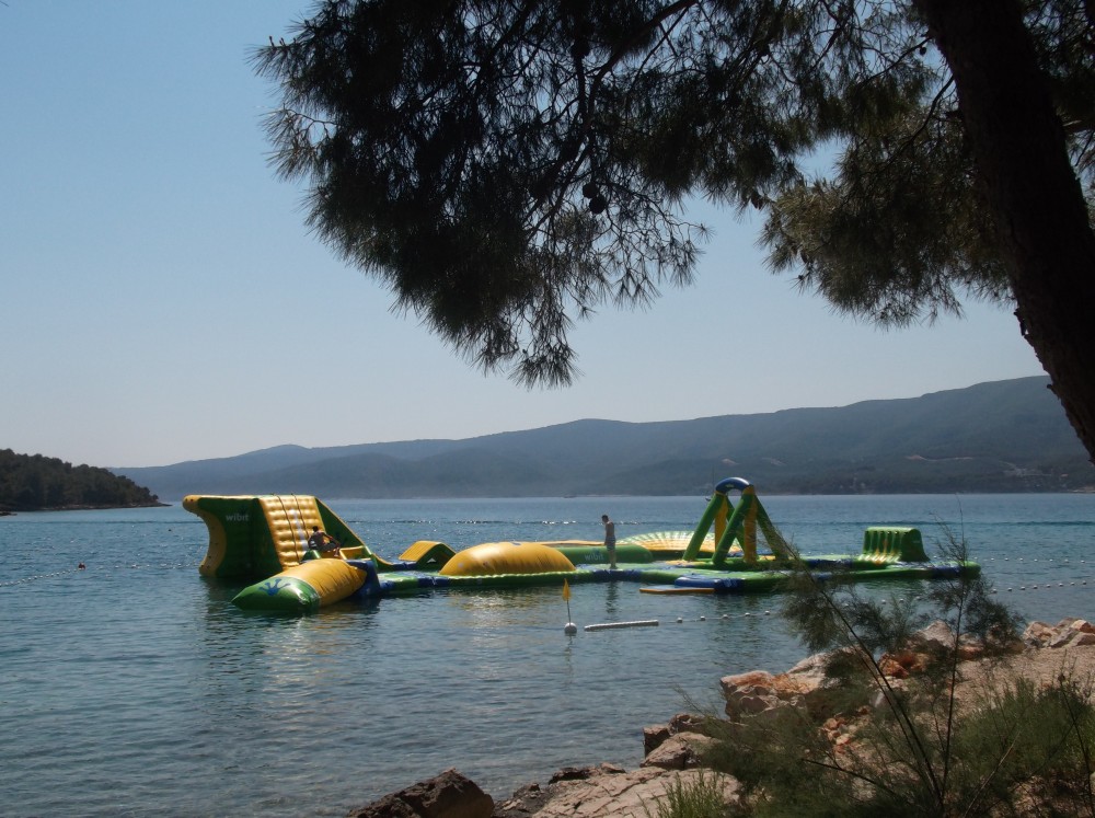 Nebojte se, trasa vede celkem po rovině, ve stínu borovic, podél moře. U nás si kola můžete půjčit. Pojedeme směr pláž Solina a hotel Adriatic. U oblázkové pláže Solina je nově nainstalován Dětský park – různé vodní atrakce v moři. Nevím, jak moc bude využíván. Podívala jsem se na ceny a 100,- Kč za půl hodiny je cena nesmyslná.