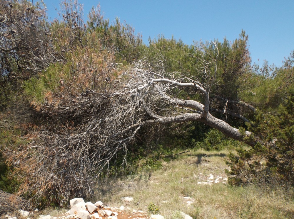Blížíme se na špici ostrohu, jsme již mírně zpocení. Moře se otevírá a láká ke koupání. Zde většinou cvičíme jógu. Všude podél ostrohu jsou soukromé plážičky, samozřejmě nudistické, pokud si zamanete. Zapomeňte na přecpané pláže. To zde nehrozí. Ploché kameny jsou jako dělané pro opalování. Ale pozor na kluzké kameny v moři! Ježci tu nejsou, ale boty do vody se vyplatí. Nemusíte mít slunečníky, všude stíní a voní borovice. Cikády cvrkají až do večera, kdy trochu klesne teplota. Dnes bylo 28 stupňů ve stínu.