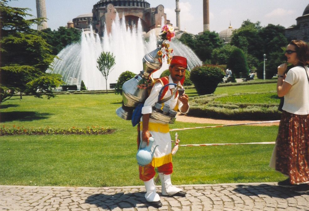 Do Aja Sofie je vstupné opět milion a velká fronta. Tak pár obrázků z venku a jdeme k Modré mešitě. Po cestě potkáváme jakéhosi prodavače limonády či moštu. Má na sobě nádherný kroj. Fotíme se s ním, dává nám napít a my mu za to pěkně draze platíme. S úsměvem nám zamává a my pokračujeme k největší mešitě. Jako jediná má šest minaretů, což potvrzuje její význam. Jinak ostatní, byť významné mešity, mají nejvýše čtyři. Běžně však jen jeden. Před mešitou je zvláštní umyvárna. Je to vždy stolička s kohoutkem vody. Tady si všichni muži před vstupem do mešity umývají nohy. My jsme to v tom vedru pojali trochu jinak a umyvárnu využíváme kompletně, nejen na nohy. Nikomu to okolo nevadí, nikdo nic neříká. Parádně nás to zchladilo.