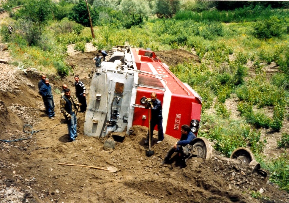 Přijíždíme do stanice YENIYPAN, kde je i posun. Oživením je oslík, co se tu prochází mezi kolejemi. Po chvíli další jízdy je vzrůšo. Vedle kolejí leží lokomotiva koly vzhůru. Šestikolák. Leží kousek pod svahem a jsou na ní už „nehoďáci“. Luboš se k tomu vyjadřuje coby odborník. Náš vláček ale jede pomalu dál. Při vjezdu do jednoho nádražíčka zůstává stát těsně za návěstidlem a strojvedoucí vylézá z mašiny a kráčí podél vlaku se přesvědčit, co tam bylo. Asi je to v pořádku, jelikož se hned vrací na lokomotivu a my pokračujeme dál. Jenže venku začíná pršet a to asi změní naše plány. Rušíme program a ve stanici HINEDEDE nevystupujeme a jedeme dál až do KAYSERI.