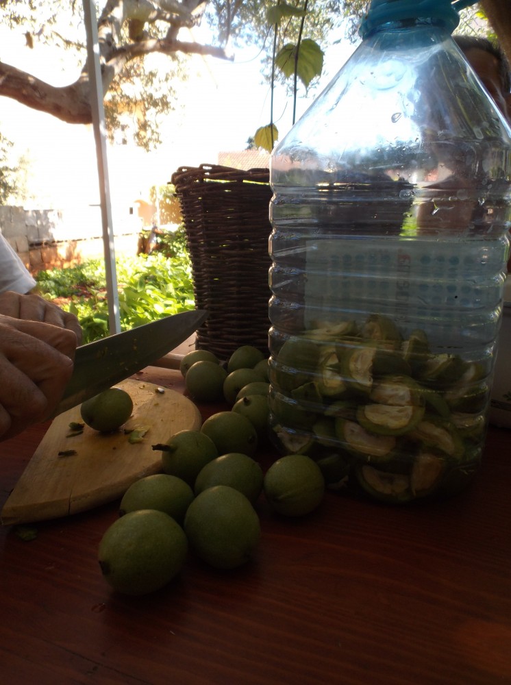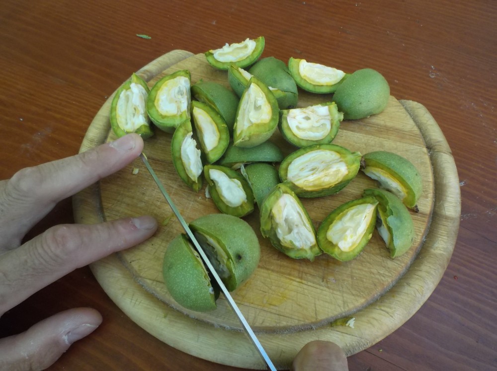 Přibližně padesát nezralých ořechů omyjeme, osušíme a nakrájíme na půlky, případně čtvrtky. Doporučuji, aby tuto část přípravy dělal mužský, jemu skoro černé prsty většinou nevadí:)), jinak lze použít rukavice. Ořechy umístíme, přesněji nastrkáme do pětilitrové, nejlépe skleněné lahve, přidáme krystalový cukr, půl až jedno kilo, podle toho, jak moc máme rádi sladké. Přidáme koření – 5 kousků skořice, dvacet hřebíčků, 15 kuliček jalovce a celou kůru z dvou až tří citronů.