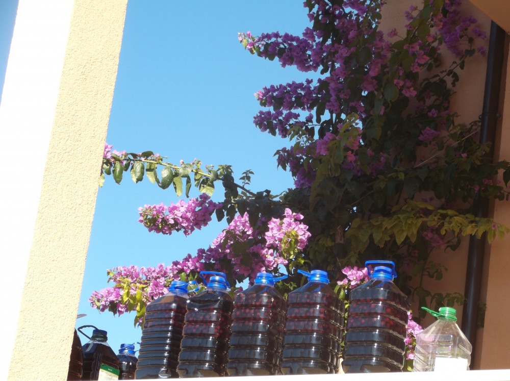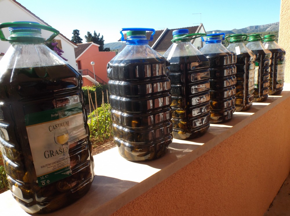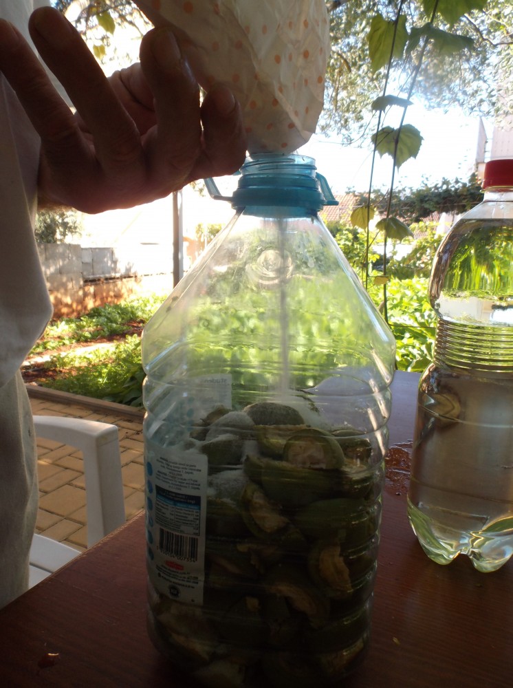 Obsah lahve zalijeme rakií. Uzavřeme ji víčkem, případně mikrotenovým sáčkem a gumičkou a umístíme na teplé místo. Vhodný je například parapet, kam svítí sluníčko. My lahve stavíme na zídku terasy, kde je necháme stát asi čtyři týdny. Vedle skleněných lahví musíme používat i pet lahve, skleněných totiž tolik nemám. Zde na ostrově lákavý likérek nemusíme hlídat, nekrade se. Likér dostává postupně tmavou barvu. Nakonec přecedíme výluh přes hustý cedník.