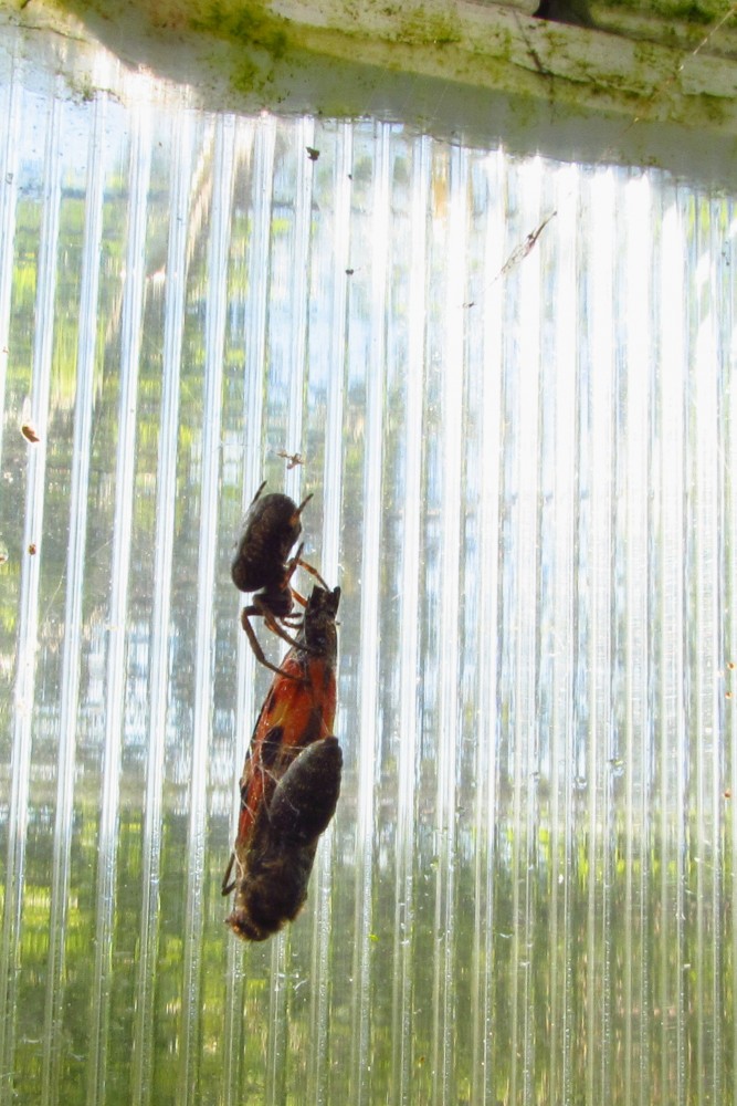 Motýlka mi bylo líto, ale pavouků se bojím, nedokázala jsem ho zachránit. Z patřičné vzdálenosti jsem tuto chvilku z pavoučího života vyfotila. Když jsem se vrátila večer, z motýla už tam zbyla jen suchá křídla. I taková je příroda.
