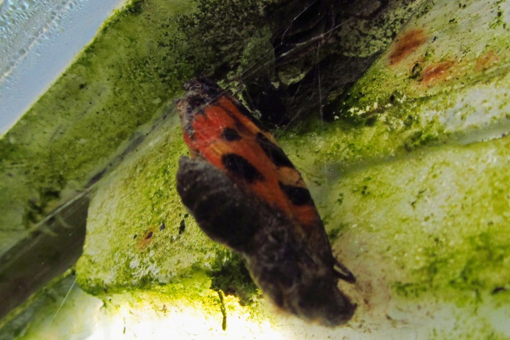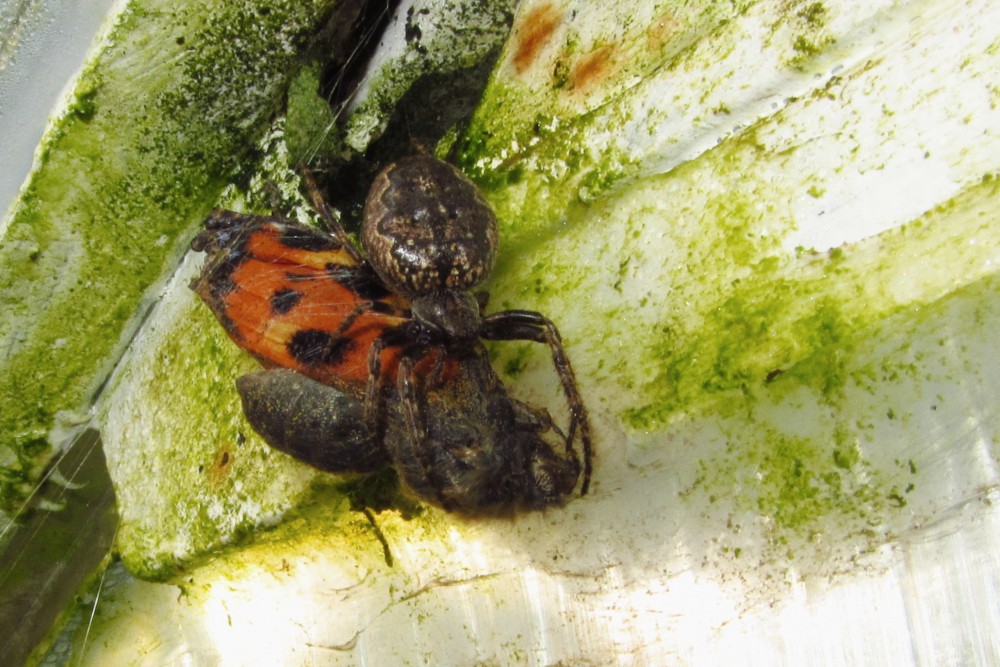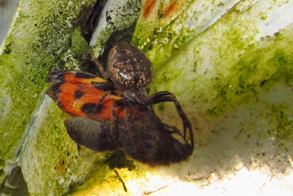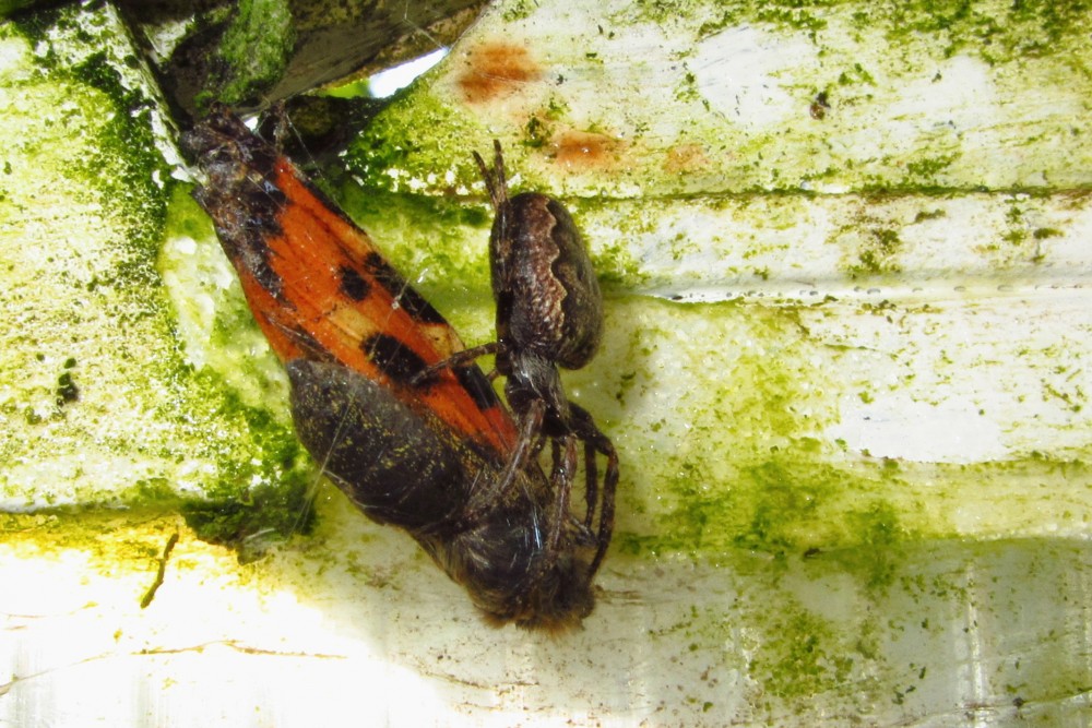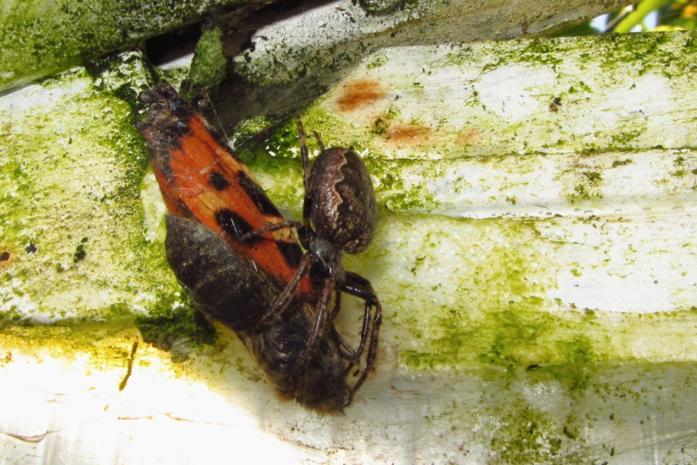 Je letní ráno, motýl si nedal pozor a chytil se do pavoučí sítě. V mžiku u něj byl pavouk (kde byl dosud schovaný?) a začal "běhat" kolem motýla. Proč asi, přemýšlím. Už to vidím, omotává motýla jemným vláknem pavučiny. (krátké video). Potom si svou kořist vynesl nahoru nad pavučinu, "posnídal" a zase se schoval do nějaké skuliny.
