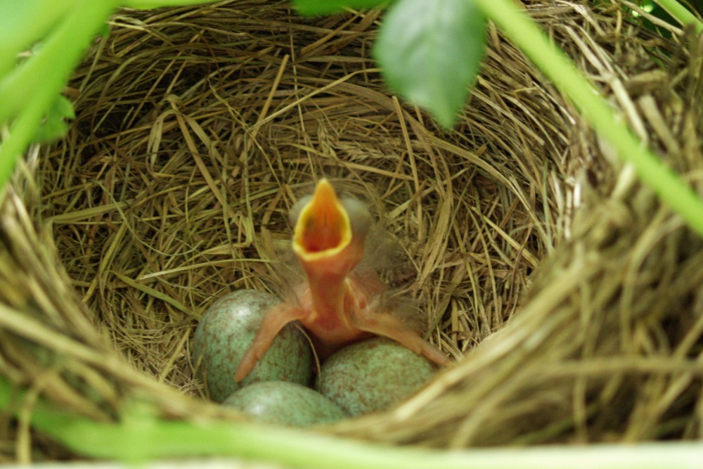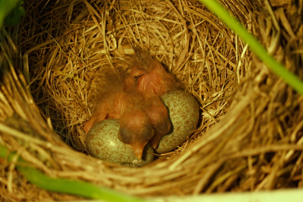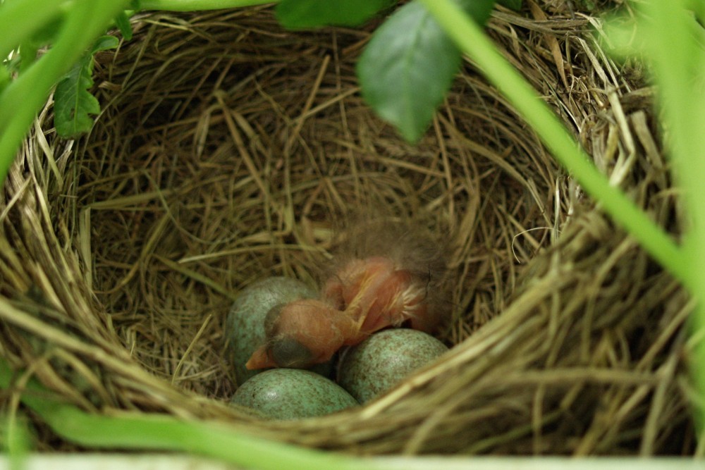 Postupně snesla čtyři vajíčka - každý den jedno. Pečlivě je zahřívala, odletěla vždy jen na chvíli, asi za potravou. Malí kosáčci se také klubali z vajíček postupně, během tří dnů. Krmili je oba rodiče. Kos i kosice, střídavě nosili plné zobáčky žížal, od časného rána až do večera.