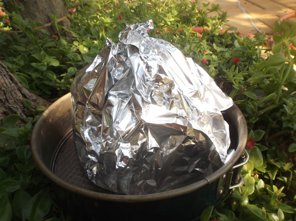 Zatím zapnu troubu na 230°, nechám v ní rozehřát dortovou formu vyloženou křížem dvěma pruhy alobalu – musí být dosti dlouhé, aby se mohla vytvarovat jakási čepice. Formu i s alobalem nahřívám 15 minut. Pak do něj dám těsto. Alobal musí vytvořit takovou čepici asi 15 cm nad chlebem, zakroutím alobal, aby se chleba mohl péci zakrytý „ ve vlhku" a aby kůrka nebyla moc tvrdá.