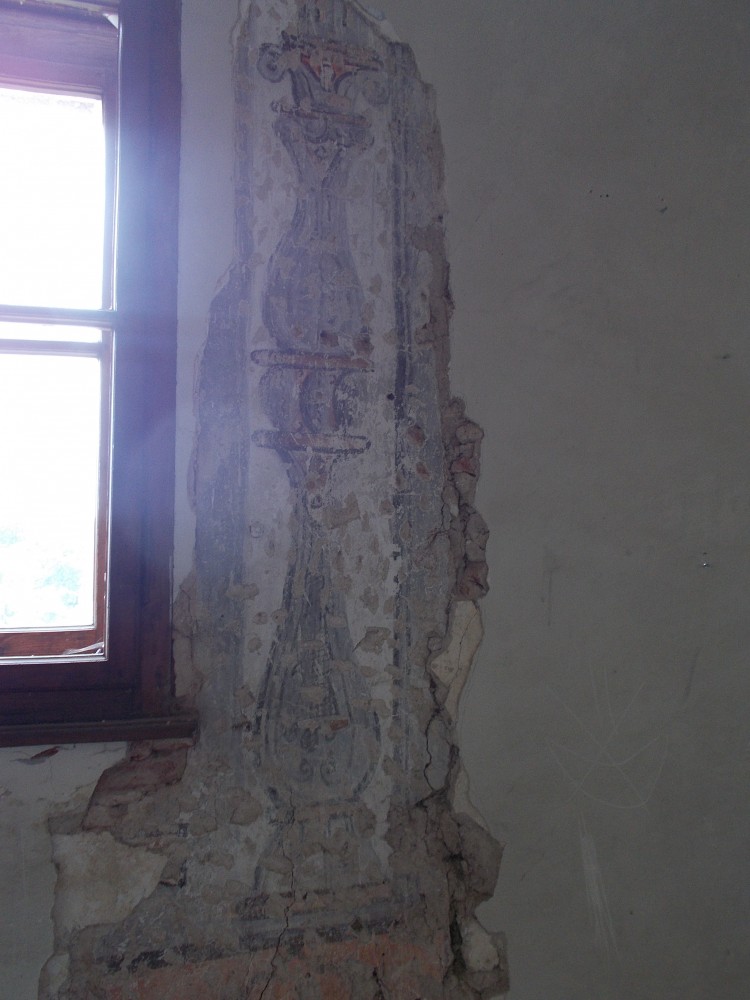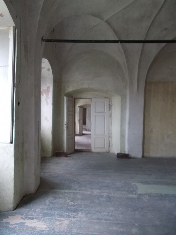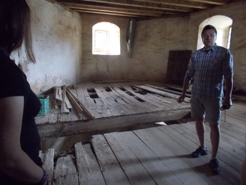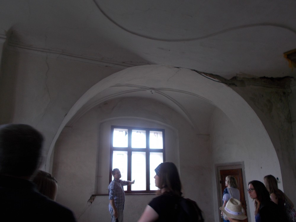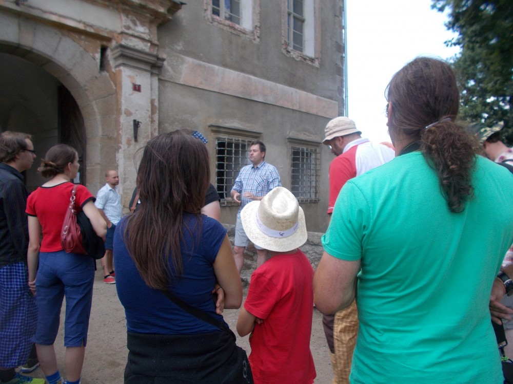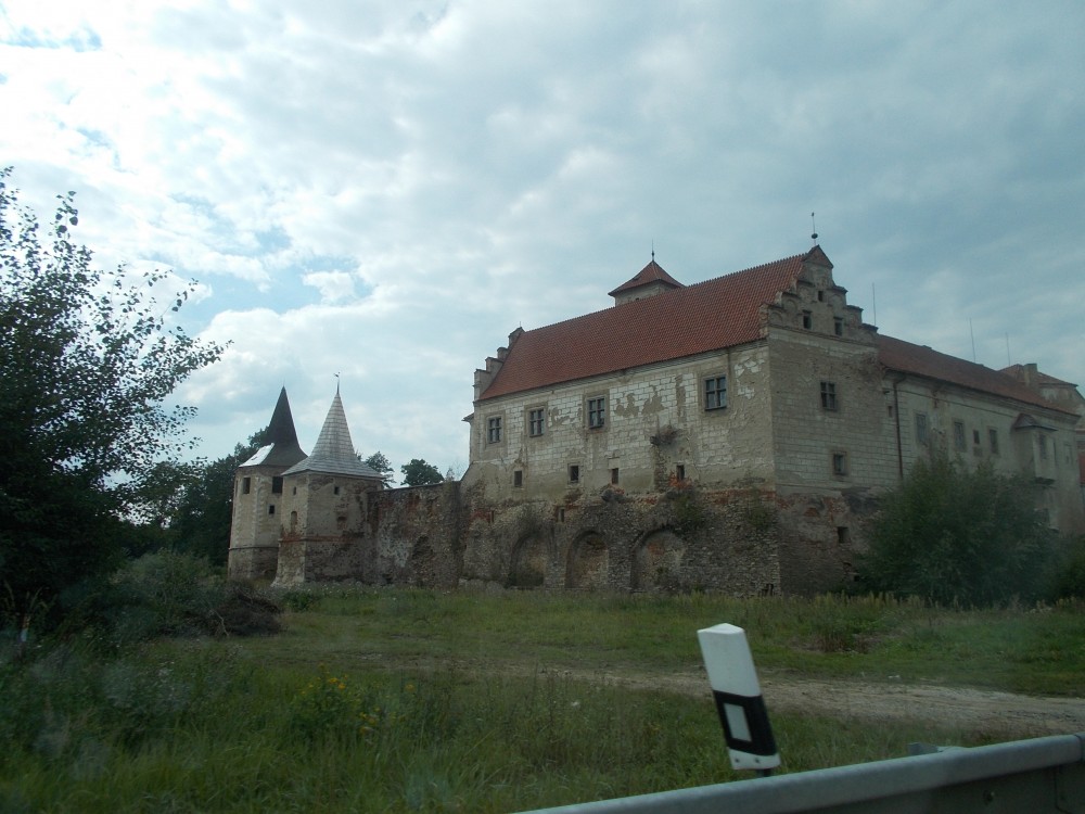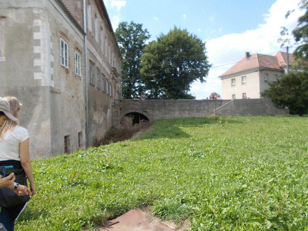 Zatím obejdeme zámek a počkáme si na ohlášenou prohlídku ve 13:00. Bude nás provázet pan Jan Beránek, historik a památkář, který vede průzkum na tomto zámku. V blízkém okolí zámku jsou již vidět stavební úpravy. Vodní příkop, v němž asi nikdy nebyla voda, jen udržované patřičné vhko, aby znesnadnil přístup k zámku. Téměř sesutá střecha na jižní straně je částečně opravená.