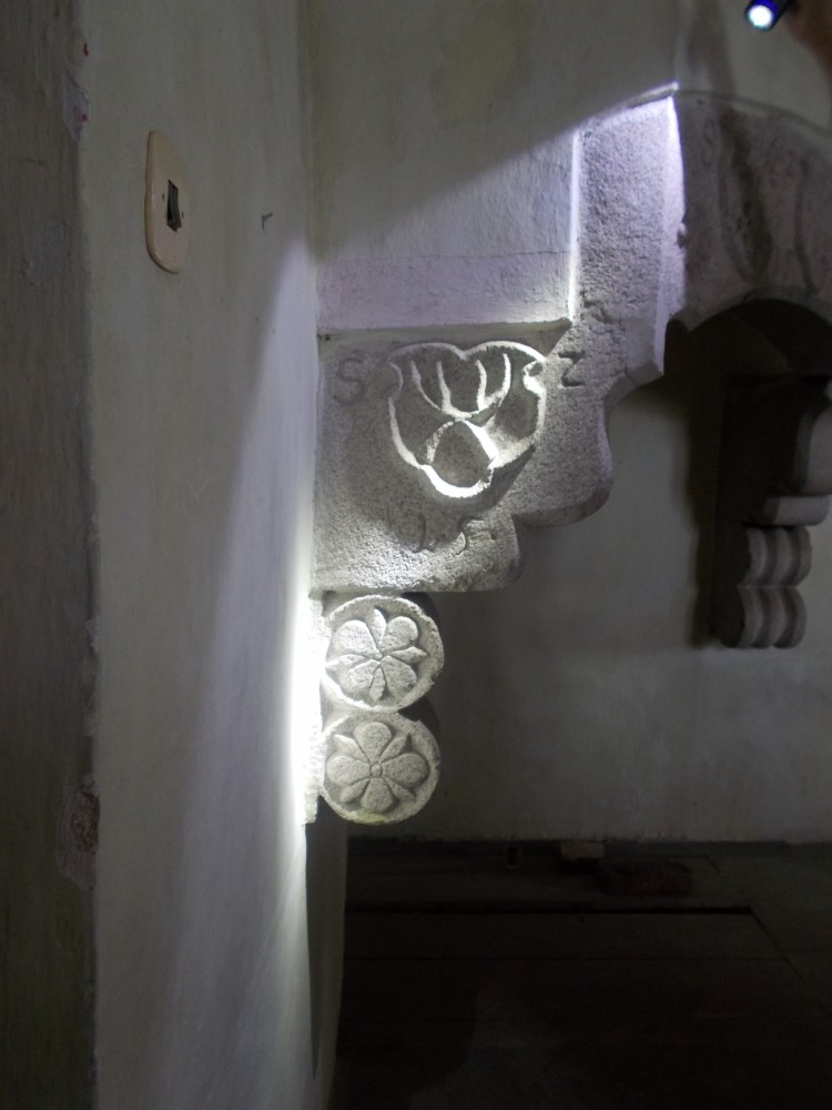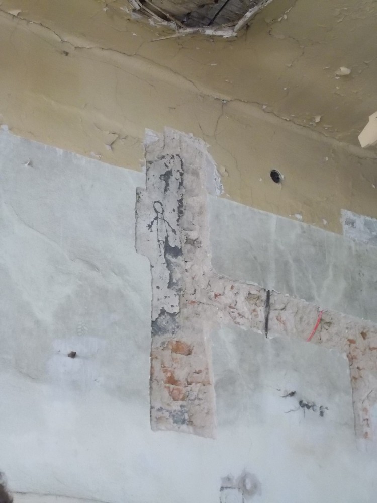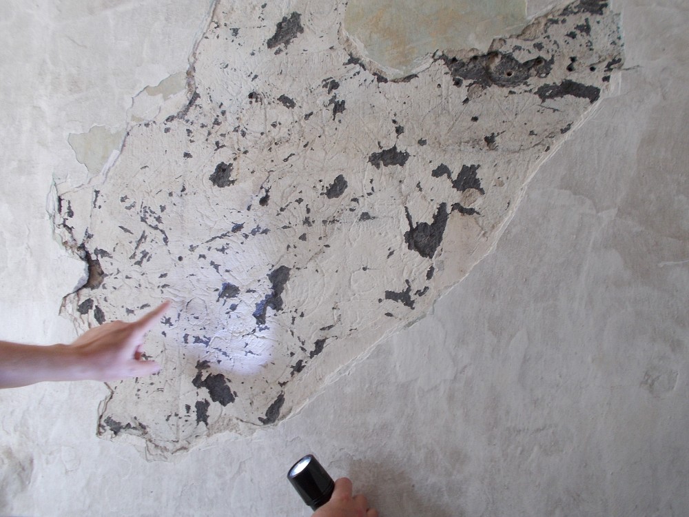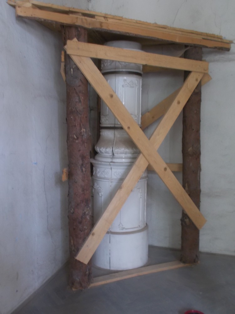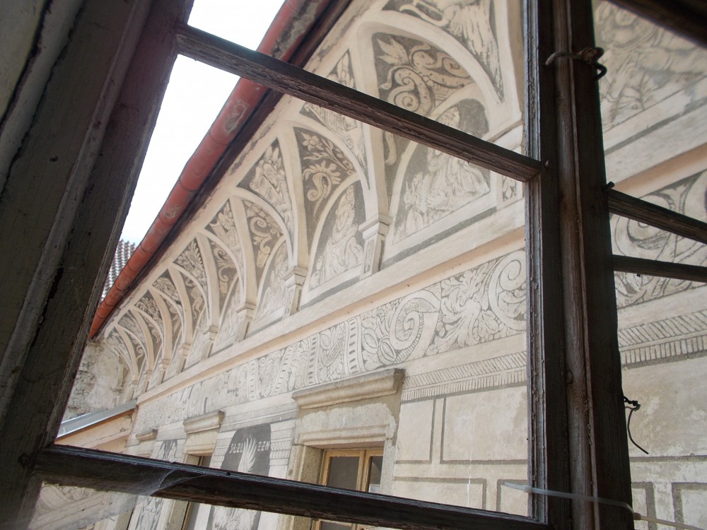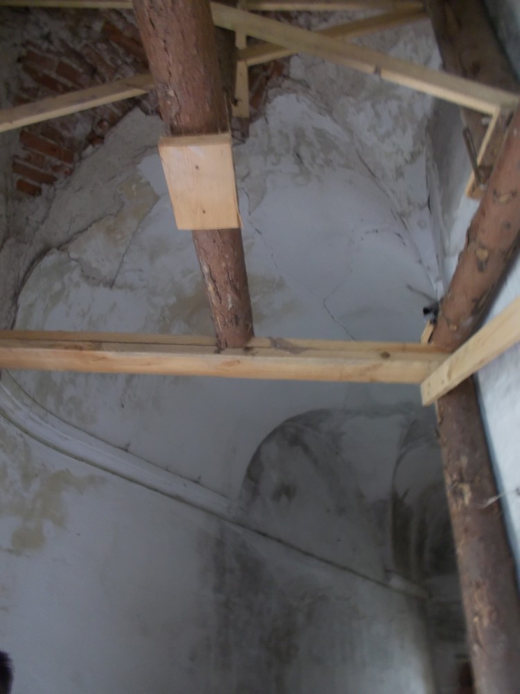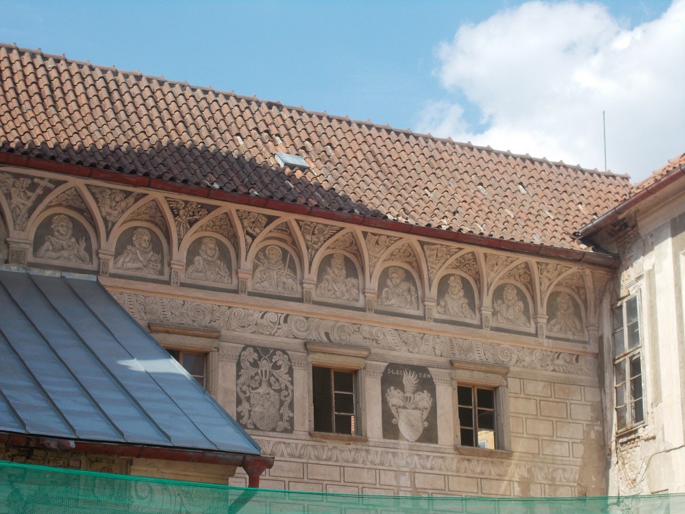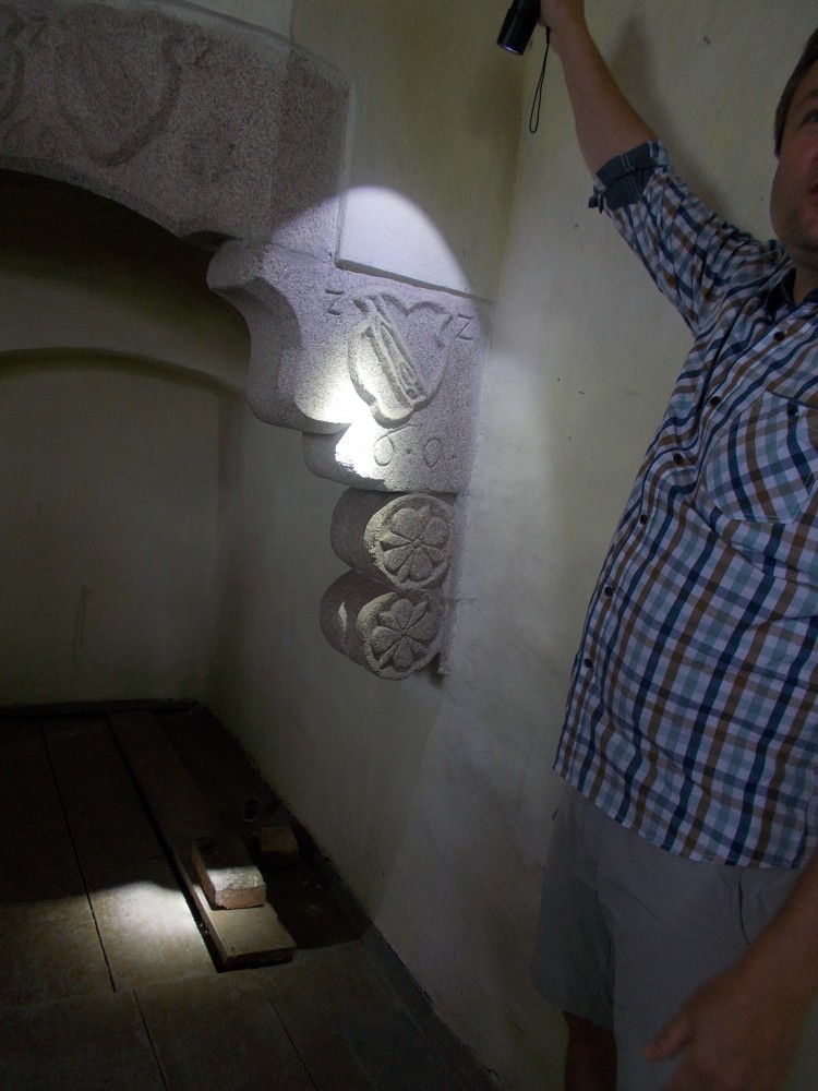 Zatím obejdeme zámek a počkáme si na ohlášenou prohlídku ve 13:00. Bude nás provázet pan Jan Beránek, historik a památkář, který vede průzkum na tomto zámku. V blízkém okolí zámku jsou již vidět stavební úpravy. Vodní příkop, v němž asi nikdy nebyla voda, jen udržované patřičné vhko, aby znesnadnil přístup k zámku. Téměř sesutá střecha na jižní straně je částečně opravená.
