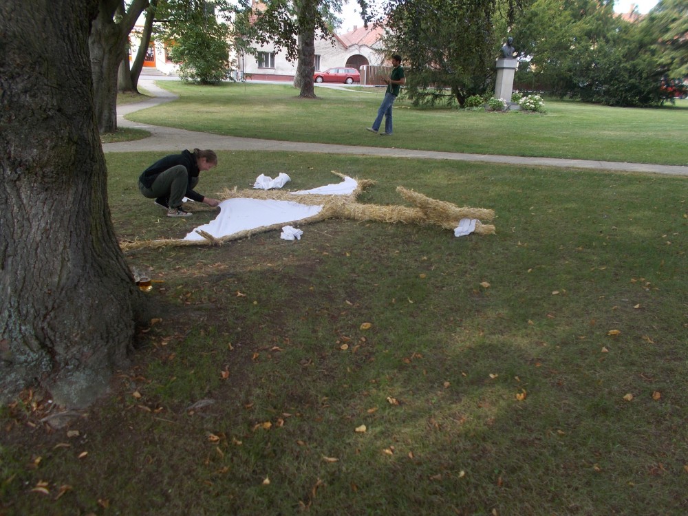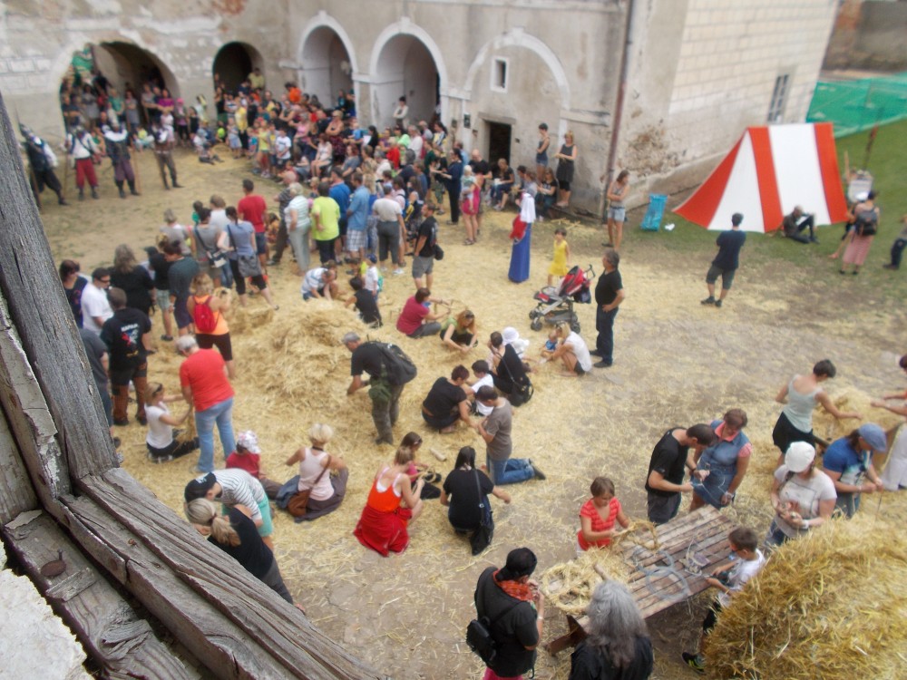 Samotné slámování se na nádvoří začíná rozbíhat. Přichází si jej vyzkoušet lidé všech věkových kategorií. Slámování vychází z drátěné kostry, kterou si každý vyrobí na místě, ať už z měkkého drátu, který se lehce vytvaruje, ale málo drží stabilitu, nebo drátu pevnějšího a silnějšího, jenž drží tvar a nechá se i postavit. Malé hrstičky slámy se přidrží u drátu a přivazují se těsně k sobě provázkem. Pro uhlazení tvaru se mohou přečnívající stébla sestřihat. A pak už jen vázat a vázat a tvarovat i dolaďovat. Všechna díla jsou v parku vystavena a hodnocena. Program dne doplňují šermíři i divadlo.