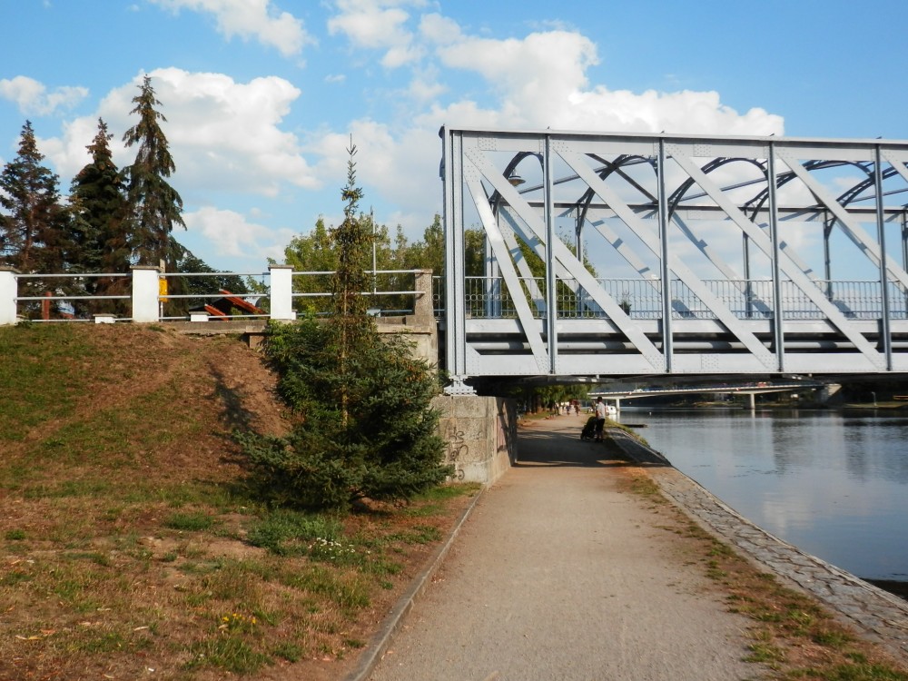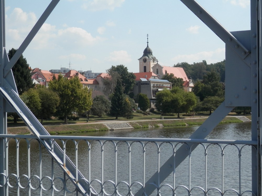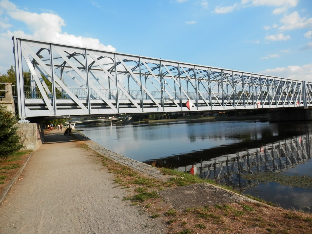 Od té doby slouží železný most pouze pěším a cyklistům. V 80. letech, když se budovala blízká Jaderná elektrárna Temelín, nenapadlo tehdejší představitele Městského národního výboru nic chytřejšího, než vést přes most obrovské teplovodní potrubí. Byl to opravdu jeden z nejhorších architektonických zásahů do vzhledu města. Na vnějším boku železné mostní konstrukce byly vedeny veliké roury, které se uprostřed mostu navíc zvedaly do výše, takže zakrývaly pohled na kostel. Mezi lidmi se hovořilo o záměru. Ta strana mostu, na níž viselo potrubí, byla ještě ke všemu  oddělena i s chodníkem od vozovky a druhé strany mostu drátěným pletivem, snad, aby tam někdo nevlezl a něco nepoškodil.