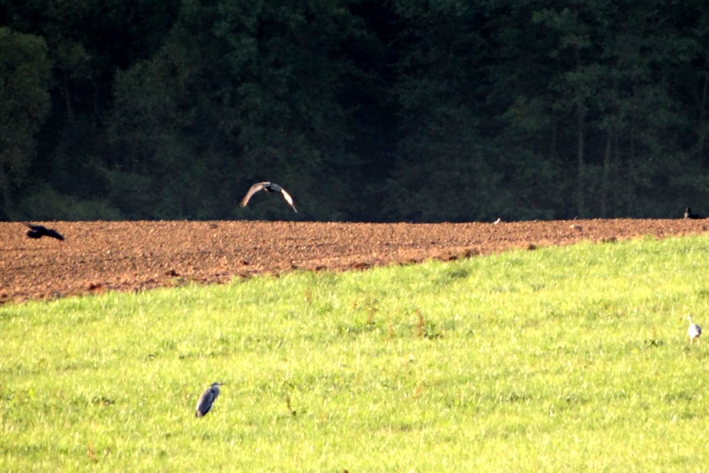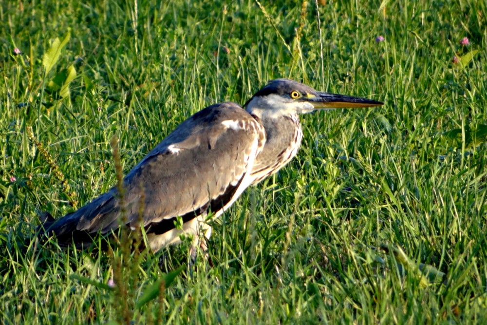 Pokračujeme v procházce určeným směrem, ale pak vlevo zahlédnu něco sedícího v trávě. Zajíc! Opatrně se přibližujeme. Ale to se už ze zajíce klube volavka. Pořád sedí na místě, tak podivně schoulená. Asi se po studené noci ještě nezahřála. Udělám ještě pár kroků a čekám, že se vznese, už nás totiž uviděla. Nic, pořád strnule sedí.