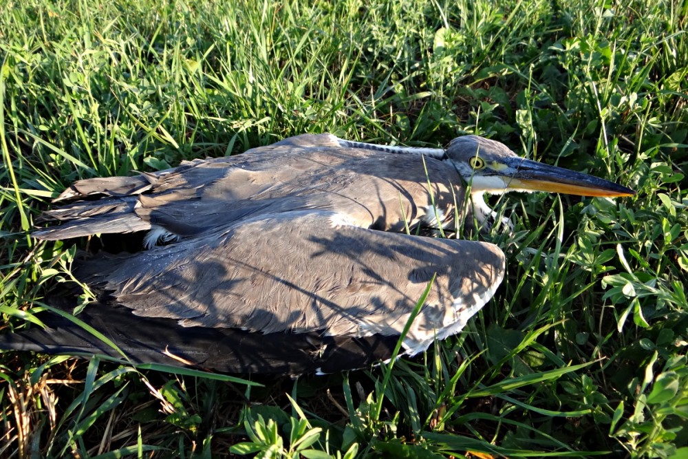 Opatrně, tiše se krademe blíž. Ale pak už mi je jasné, že s volavkou něco není v pořádku. Přiblížíme se asi na metr od ní a ona se pokusí vzlétnout. Spadne zobákem do trávy, křídla rozložená a dělá mrtvého brouka.