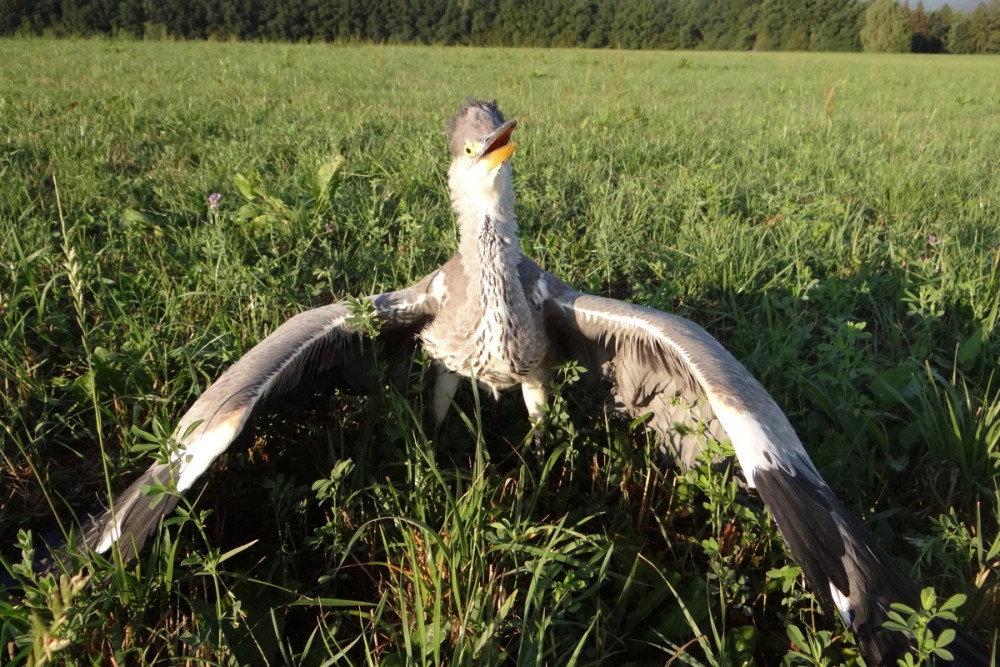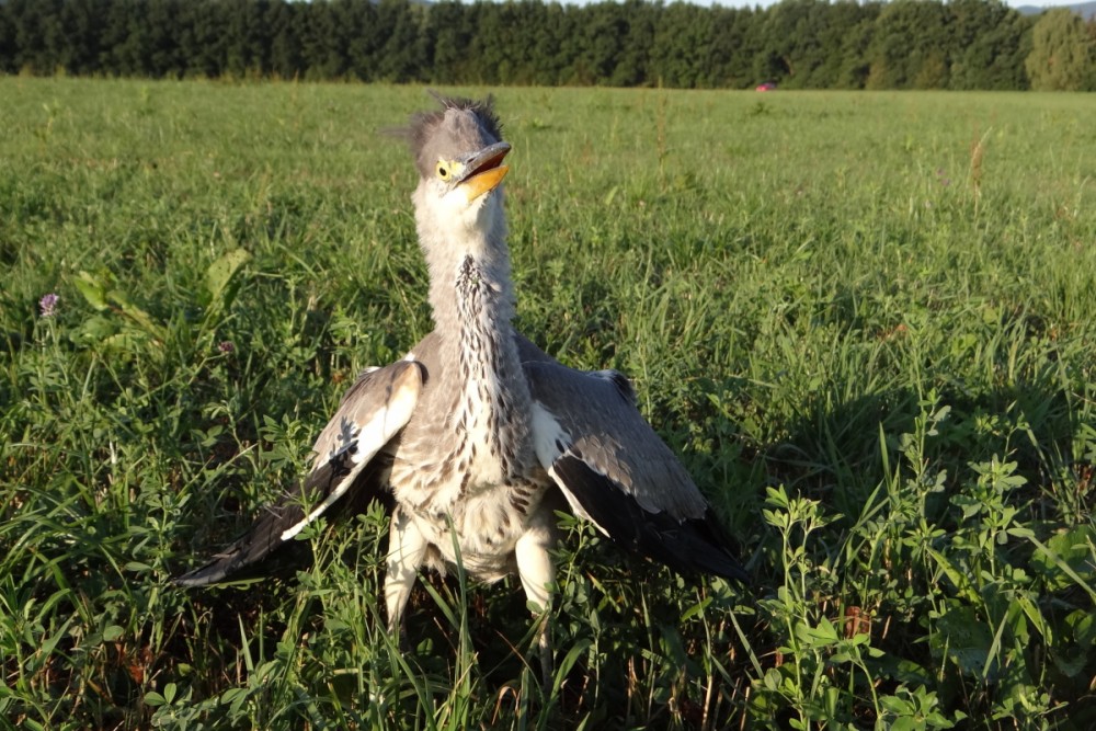 Po chvíli se vracíme k volavce a já zjištuji, že je to volavčí mládě. Chuďátko malé, zřejmě přecenilo své síly a je úplně vyčerpané. Srdnatě se proti nám zvedá do bojového postoje. Syčí, otvírá zobák a roztáhne křídla, ale znova sklesle sedá.