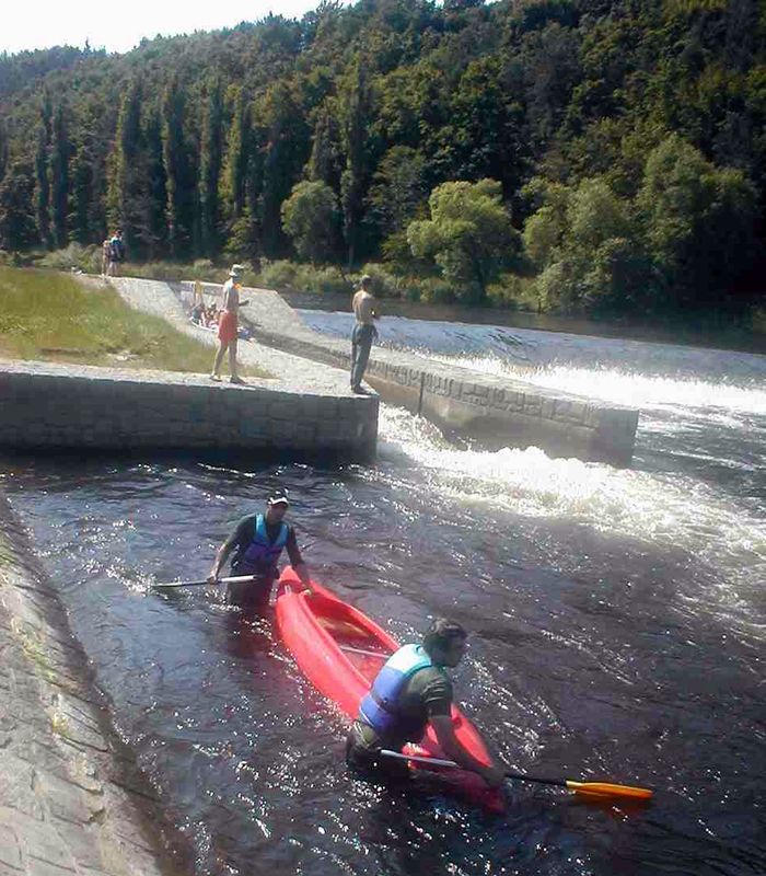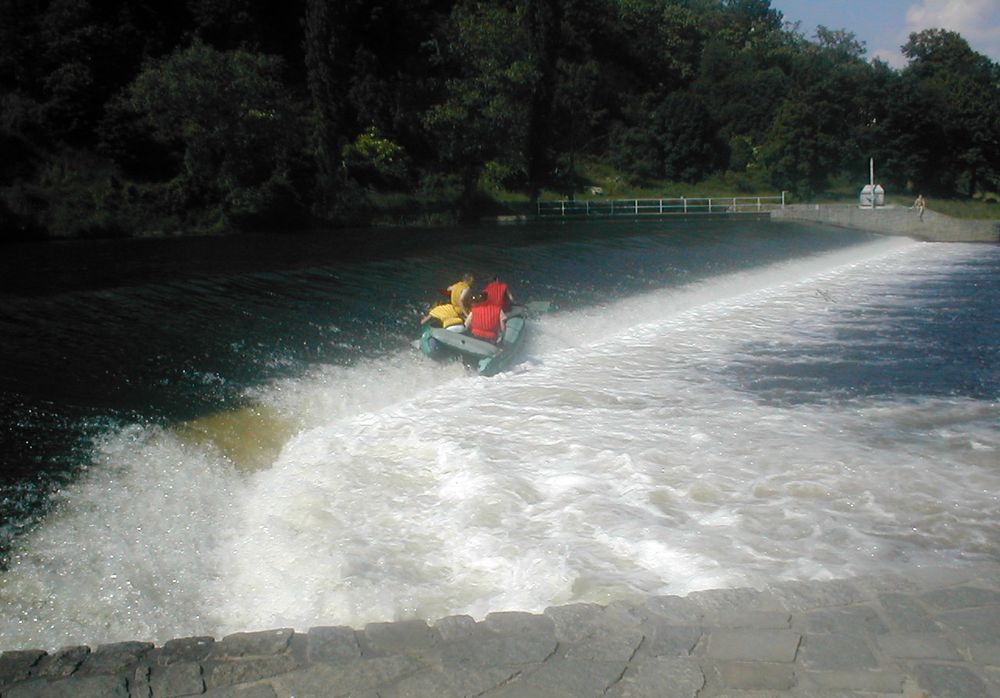 Nezkušení vodáci z raftu nebo jiné lodi - u jezů vystoupí a lehkou loď přenesou po břehu. Ti zkušenější na lodi projedou propustí v jezu - tzv.šlajsnou a většinou se nezvrhnou. A pokud se do lodi dostane voda nebo se loď převrátí, tak je spousta legrace. Zažil jsem to mnohokrát se studenty, když jsem s nimi jezdil "vodu" na různých řekách. Fotografie jsou v připojené galerii.