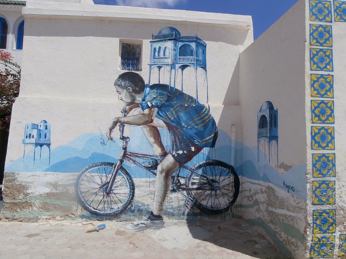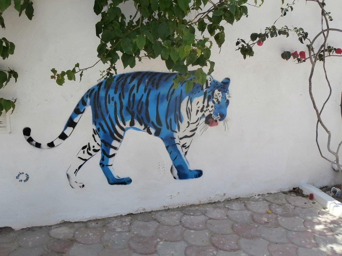 Byli jsme letos na Djerbě a protože nejsme ten tip hotel-pláž-hotel, šmejdili jsme i na vlastní pěst. Šlo to snadno, taxík najdete na každém rohu, řidiči jsou ochotní a ceny nejsou vysoké. A tak jsme se vypravili i do vesničky Er-Riadh. Je to asi dva roky, co se zde sešlo přes 100 umělců z 30 zemí světa a na zdi domků umístili kolem 250 maleb. Všechny jsme neviděli, ale i to co bylo kolem „hlavní“cesty stálo za to.