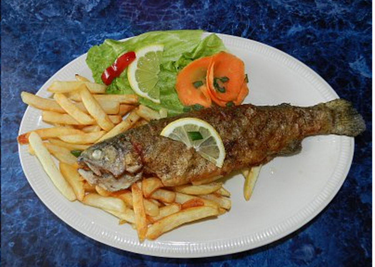 2 pstruhy, sůl, kmín, mletý pepř, grilovací koření,hladkou mouku, plátek citronu. Hranolky, zeleninu na zdobení, olej na smažení, kousek másla.
