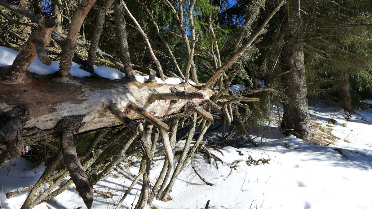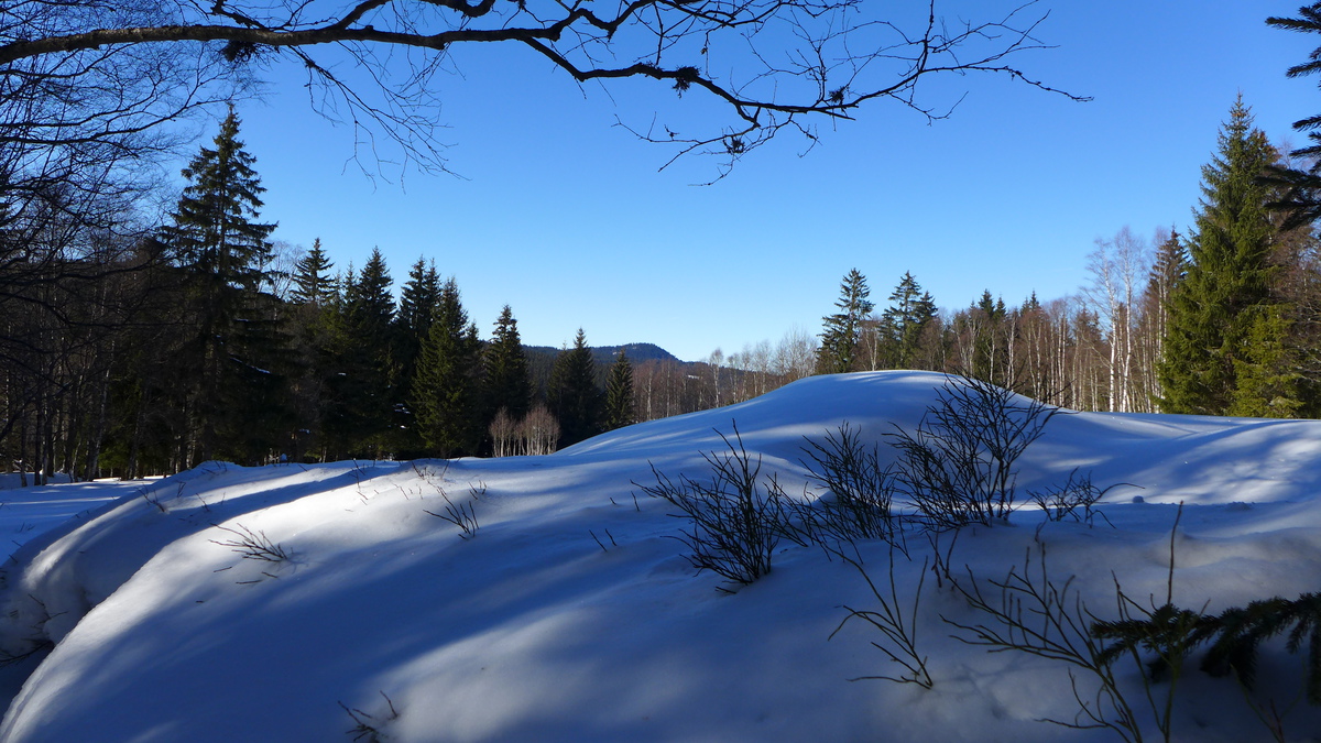 Cestu označují husté porosty smrčků, které mrazem nestačily vyrůst. Za nimi pod sněhem černá rašelina a kopečky kyselé, tvrdé trávy. Mrtvé ticho a bílá smrt. Hluboké rokle, věčný stín, žádný paprsek nepronikne klenbou mohutných stromů, starých velikánů. Mohutná soustava hraničního pásma a v dáli v modravém oparu se zubatí vzdálené Alpy jako šedá masa v mracích. Když slunce zahltí vysoké pláně, můžeme nahlédnout přes řetězy nižších kopců daleko do českých krajů.