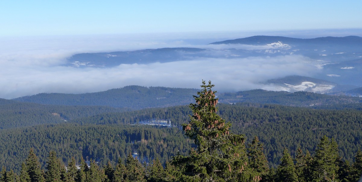 Když Šumava zapadne sněhem, krajina často mnoho dní vězí pod příkrovem šedého nebe v jiskřivém mrazu. Někdy údolí zaplavuje bílá mlha a jak ostrovy z moře vystupují z ní vrcholky hor.