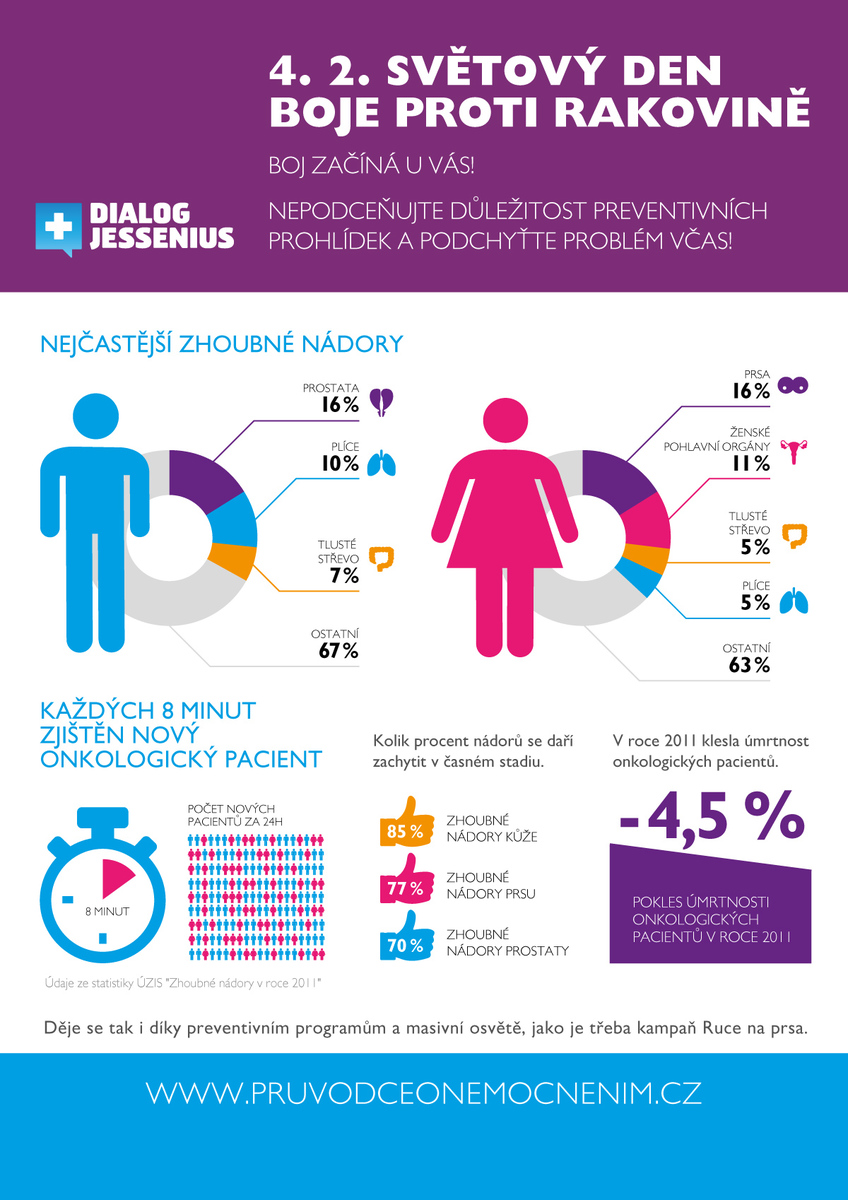 Čtvrtý únorový den je již od roku 2000 vyhrazen Světovému dni boje proti rakovině. Jeho cílem je upozornit na důležitost preventivních prohlídek a včasného zjištění onkologického problému. Mezi projekty, které informují a vzdělávají širokou veřejnost v této oblasti, patří také kampaň Ruce na prsa a edukační filmy Průvodci onemocněním, které realizuje obecně prospěšná společnost Dialog Jessenius.