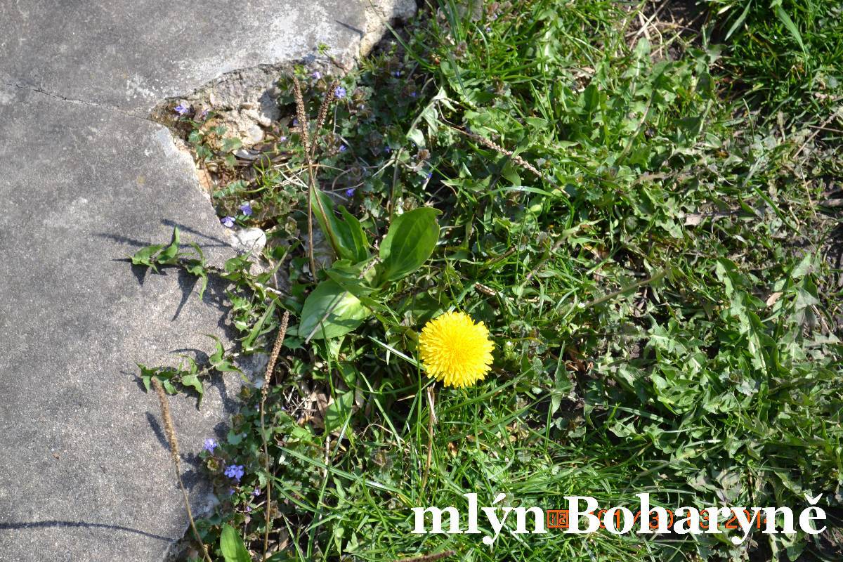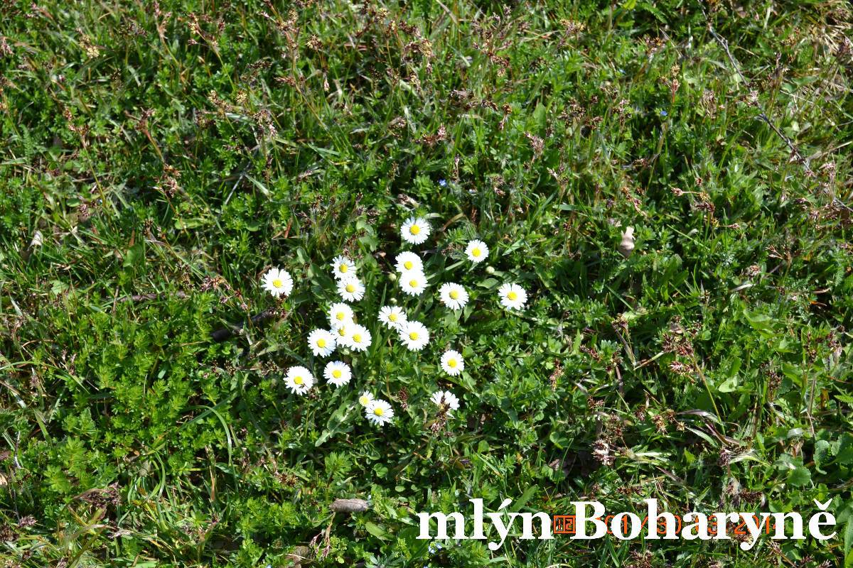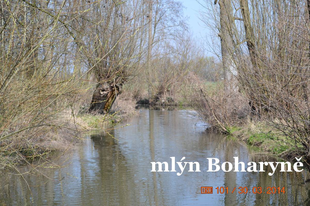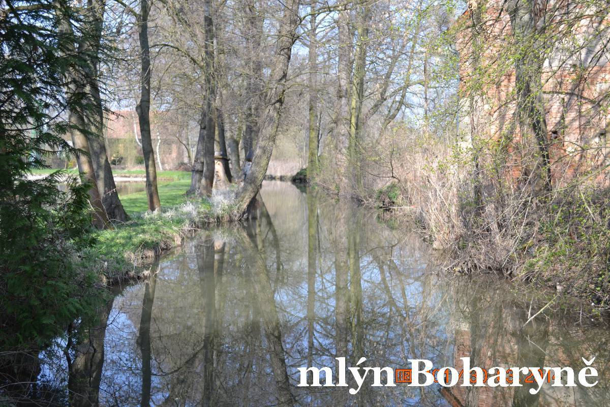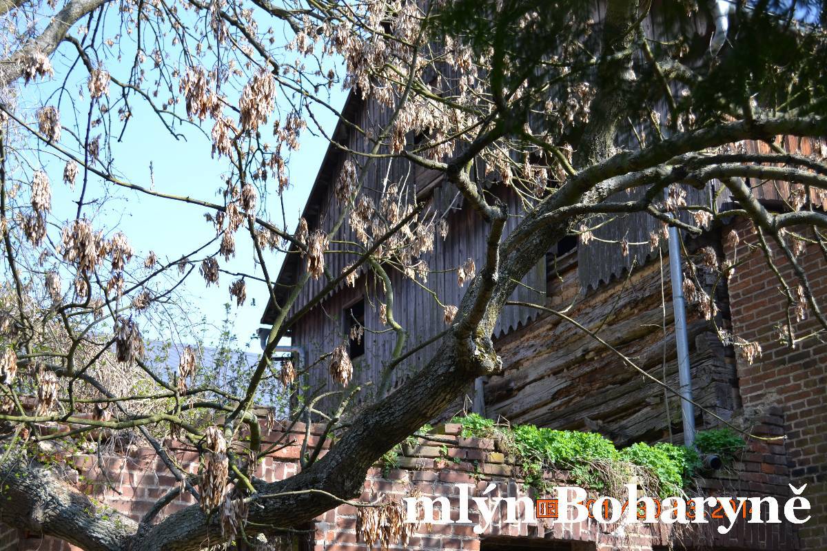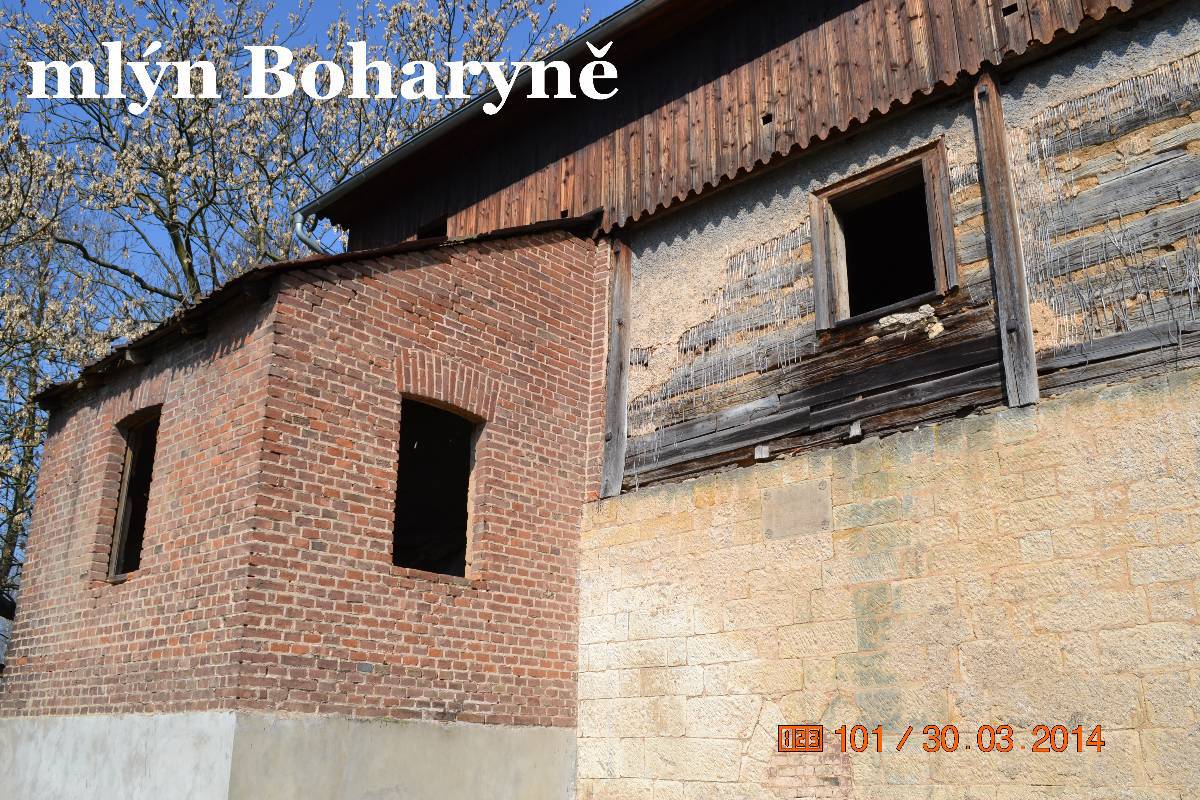 Nasedáme a jedeme do Boharyně. Tady je starý dřevěný mlýn. Maličko hledáme, ale nakonec zastavujeme u rybníka. Mlýn je před námi, ale bohužel na druhé straně přívodního kanálu. Okolo zdymadla se však dá protáhnout a tak stojíme před vraty areálu. Musel to bývat velký mlýn. Bohužel se nedá vstoupit ani na dvůr. Prý stavební úpravy. Však to je potřeba jako sůl. Zatím je ale opravená jen střecha na příslušenství. Je to stavba na dlouhou trať.