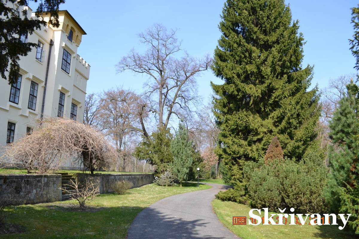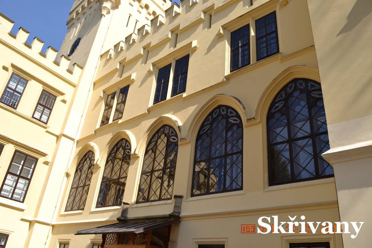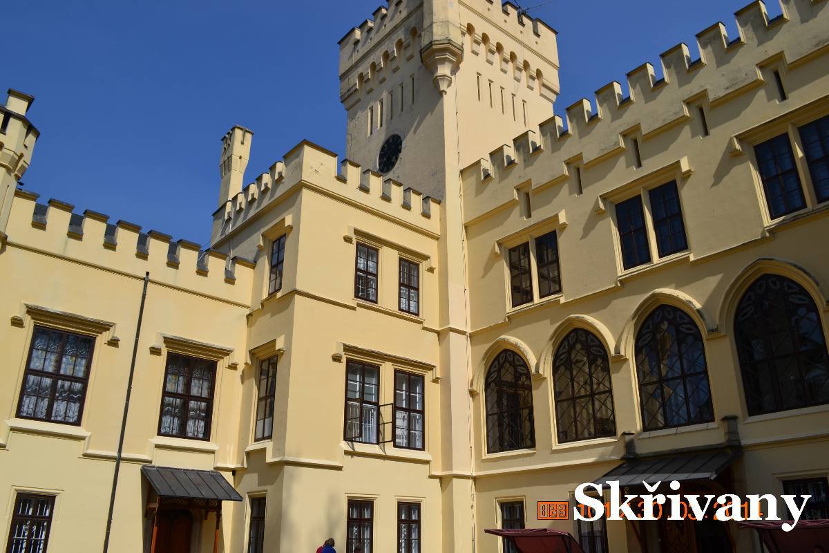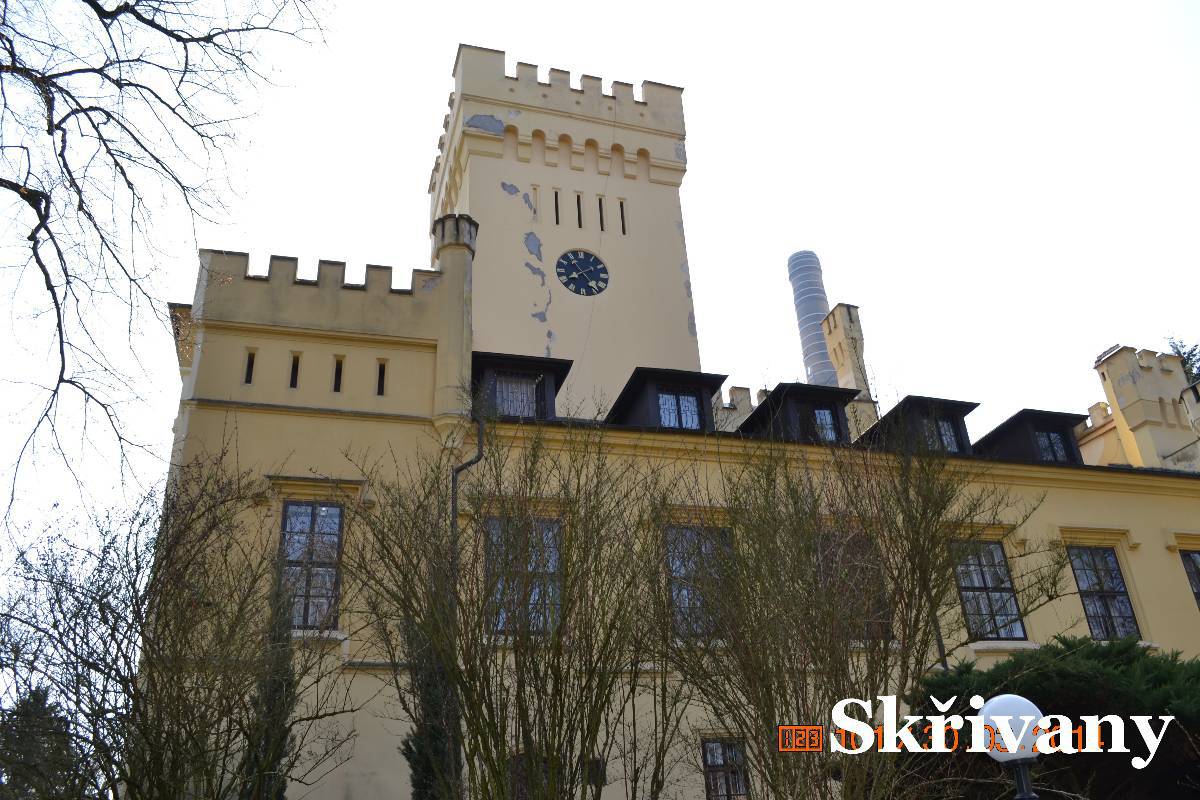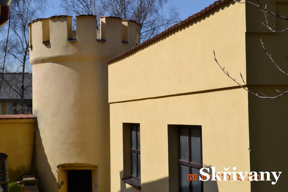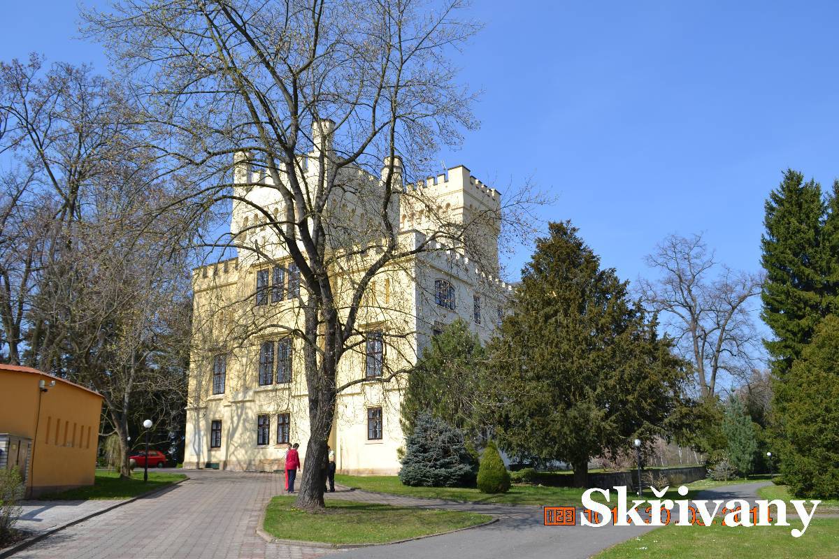 Další zastávkou jsou Skřivany. Tady za bývalým cukrovarem je v pseudogotickém stylu malý zámek. Vrata jsou otevřená a tak jdeme do parku. Zámek je dnes využívaný jako ústav. Děláme kolečko okolo zámku ale když jdeme k vratům,zjišťujeme, že vrata jsou zavřená. Co s tím? Ale jedna z učitelek se otáčí k zámku a po chvíli se vrata otvírají. My okolo krásně opraveného cukrovaru se vracíme na silnici. V zatáčce naproti kostelíku je malá chaloupka s dřevěnou zvoničkou. Zastavujeme a jdeme si chaloupku prohlédnout. Koukáme přes vrata a po chvíli je objevují majitelky a zvou nás na dvůr. Tak máme možnost si chaloupku prohlédnout i zevnitř.