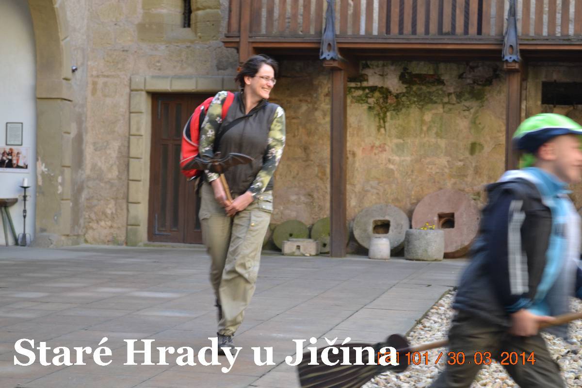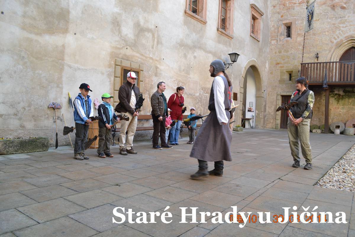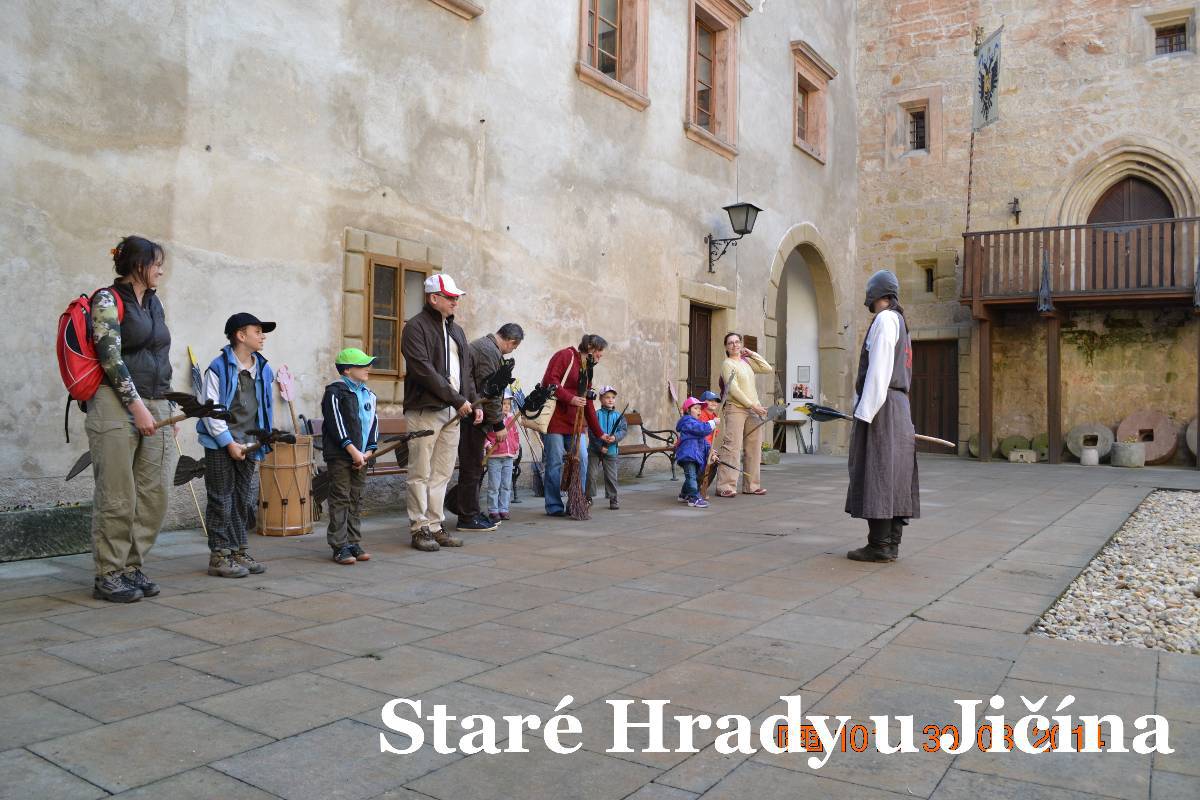 Po zamknutí auta jdeme ke hradu a procházíme vstupní branou do nádvoří. A tam nádherný šok. Rázem jsme v pohádce. Jen srdce plesá. Všude samá veselost, usměvavé děti i rodiče. Na nádvoří šibenice s klecí pro lumpy, nebo pro čarodějnice. Na lavičce sedí princezna s úsměvem. Brzy mě vyvádí z omylu, je prý čertí princezna. Na nádvoří je bezva krčma i s divokým krčmářem, vlastně čertem. Procházíme druhou bránou do dalšího nádvoří. Tam právě čaroděj Archibald ovládá skupinku dětí s rodiči. No, poslouchají ho všichni úžasně. Vlastně se vůbec nedivím, dokáže upoutat pozornost dětí i rodičů. Dětem jen očička září, rodiče se usmívají. Archibald rozdává čarodějná košťata a vybírá jednu maminku jako vrchní čarodějnici. Ta po chvilce váhání kývla a postavila se vedle vousatého Archibalda. Ten poučuje jak se s koštětem létá.každý má na konci koštěte nějakého netopýra.