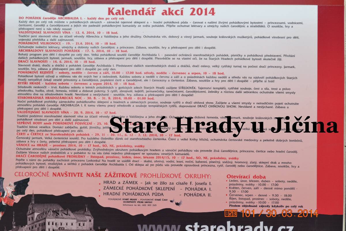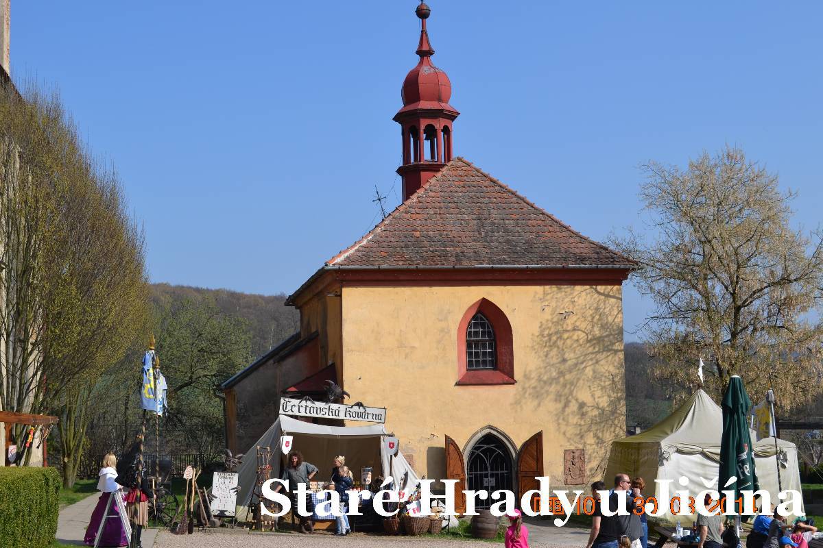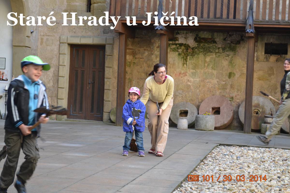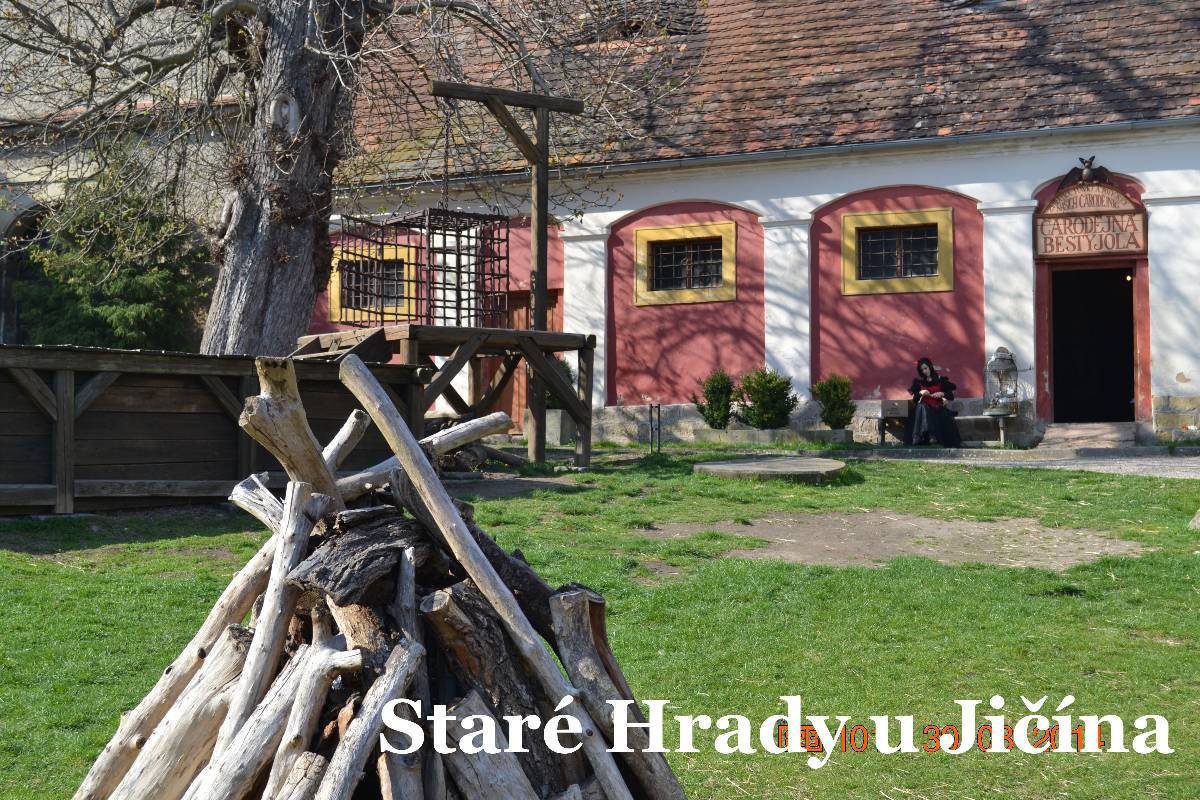 Po zamknutí auta jdeme ke hradu a procházíme vstupní branou do nádvoří. A tam nádherný šok. Rázem jsme v pohádce. Jen srdce plesá. Všude samá veselost, usměvavé děti i rodiče. Na nádvoří šibenice s klecí pro lumpy, nebo pro čarodějnice. Na lavičce sedí princezna s úsměvem. Brzy mě vyvádí z omylu, je prý čertí princezna. Na nádvoří je bezva krčma i s divokým krčmářem, vlastně čertem. Procházíme druhou bránou do dalšího nádvoří. Tam právě čaroděj Archibald ovládá skupinku dětí s rodiči. No, poslouchají ho všichni úžasně. Vlastně se vůbec nedivím, dokáže upoutat pozornost dětí i rodičů. Dětem jen očička září, rodiče se usmívají. Archibald rozdává čarodějná košťata a vybírá jednu maminku jako vrchní čarodějnici. Ta po chvilce váhání kývla a postavila se vedle vousatého Archibalda. Ten poučuje jak se s koštětem létá.každý má na konci koštěte nějakého netopýra.