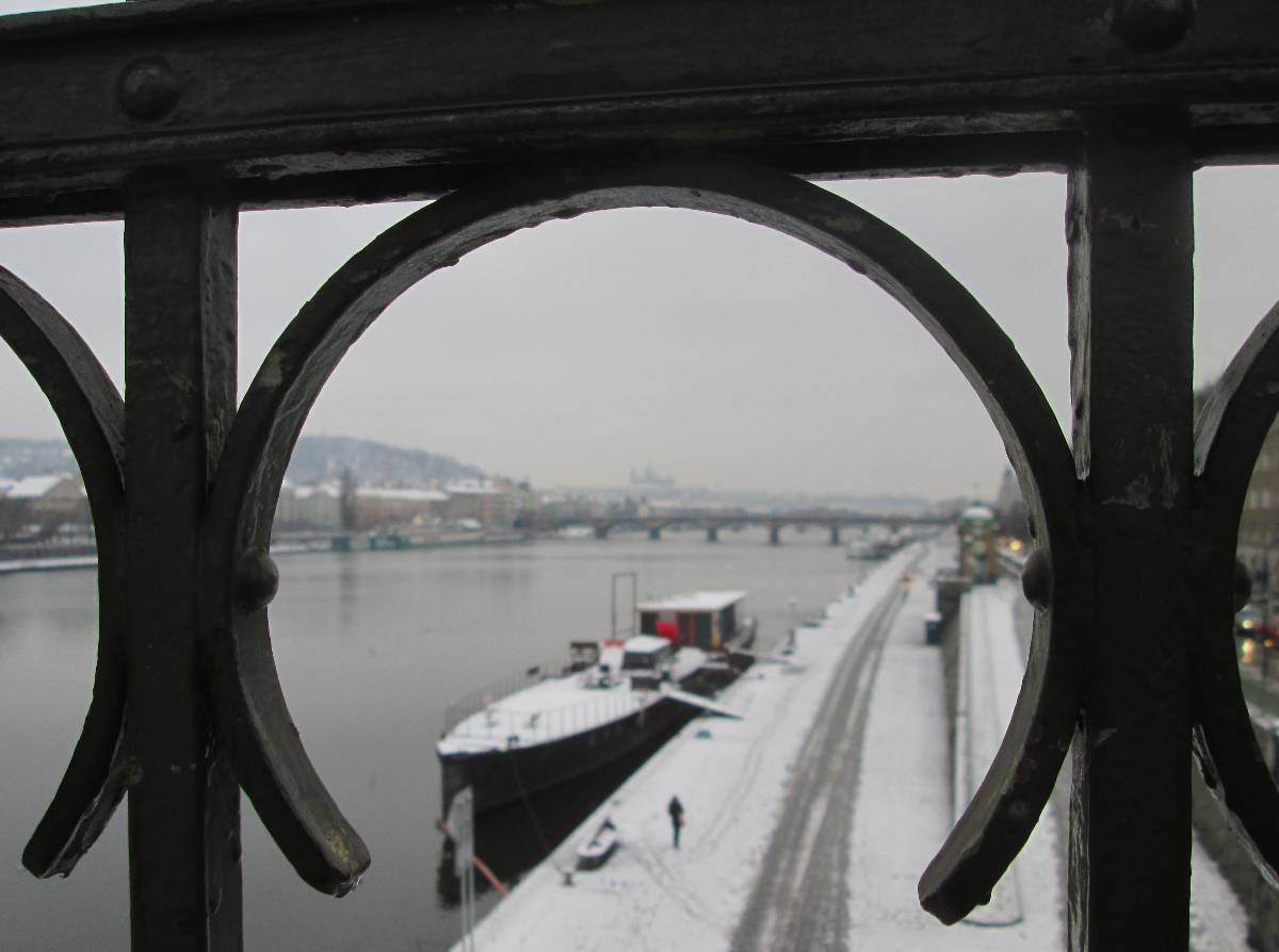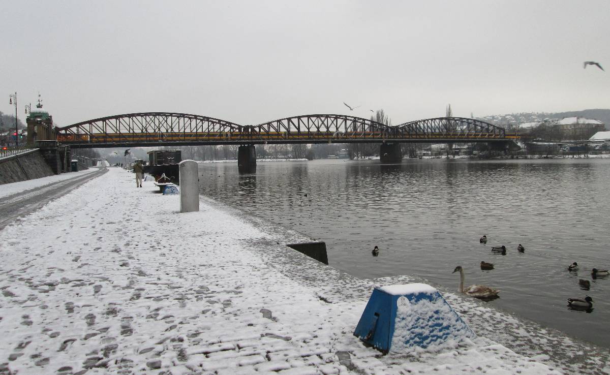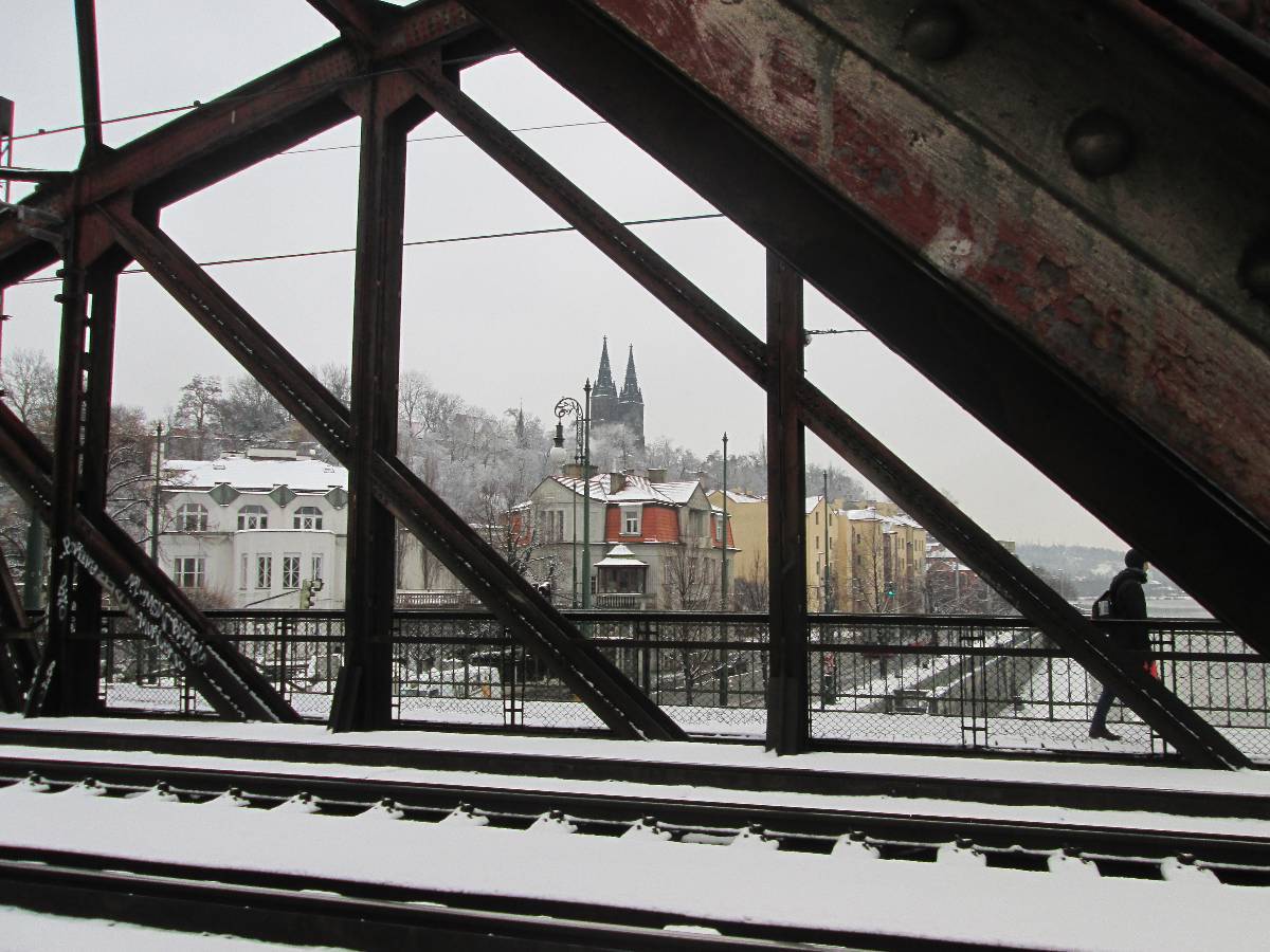 Tak jsme se od železničního mostu brouzdali s prokřehlými konečky prstů po chodníku polomokrou břečkou, vdechovali vlhký, studený vzduch, okořeněný výfukovými plyny, které dovedou zpříjemnit činnost našeho dýchacího ústrojí hlavně v tomhle počasí. Obyčejně se klasickému panoramatu Prahy vyhýbám, ale když už jednou napadl ten sníh, a když už jsem tu, tak pár fotek neuškodí.