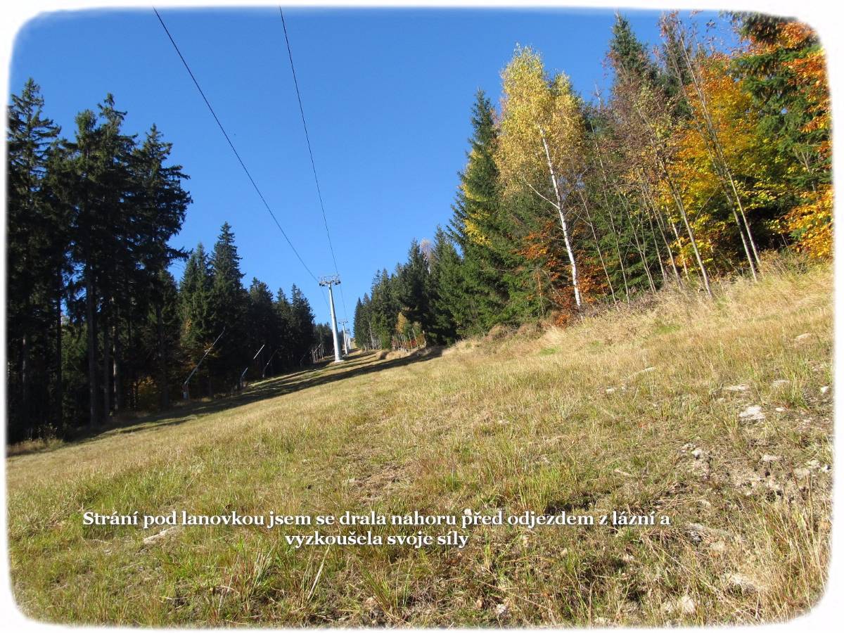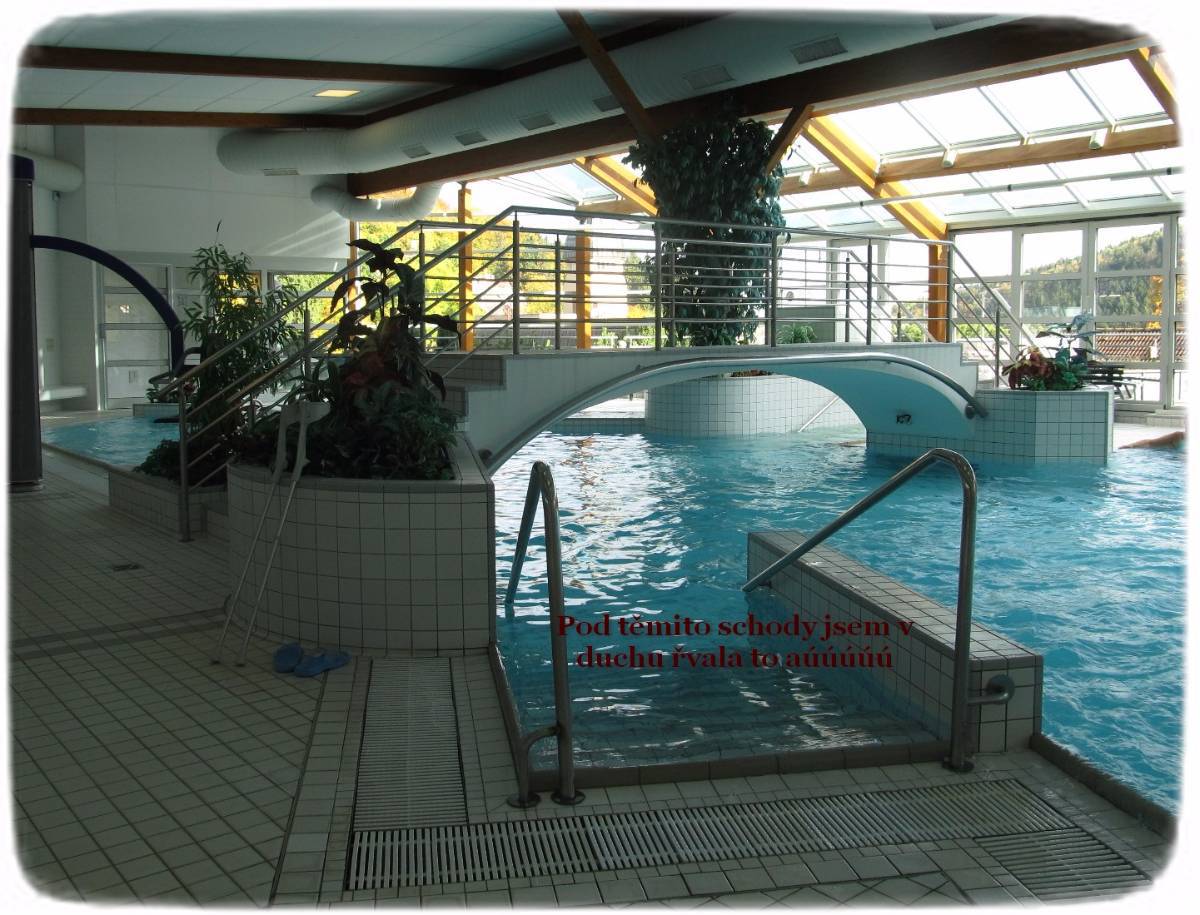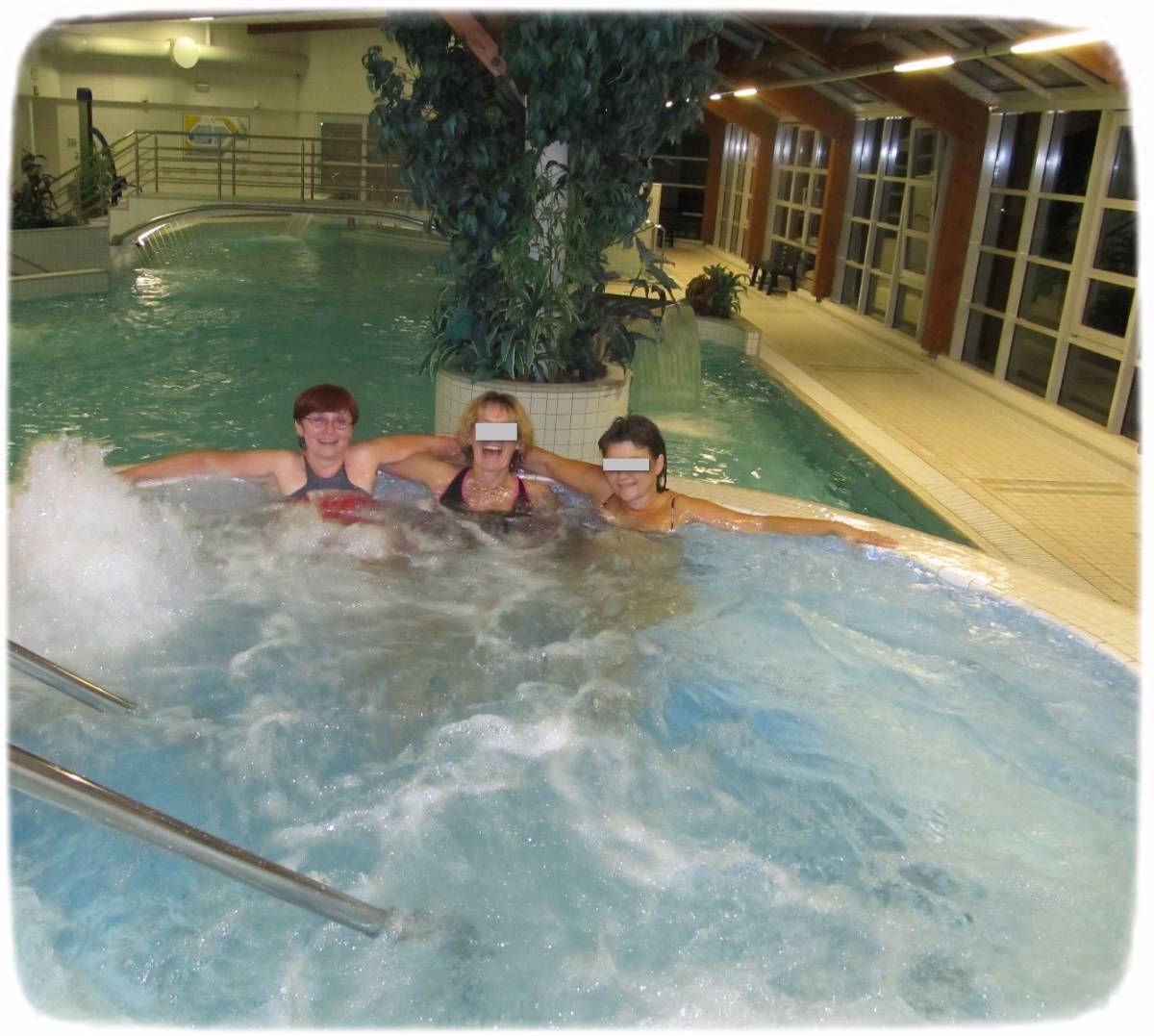 A tak nastala léčba nejen mojí tělesné schránky, ale i duše. Dny letěly jako splašené, moje fyzioterapeutka mi říkávala já Vám tady žehlím vrásky a Vy se mračíte. Ale nebyla to pravda, jen jsem usilovně přemýšlela, co dalšího podniknout. Na první opatrnou vycházku mě vzala Alena na kratší trasu, abychom zjistily, co zvládnu. A k mé radosti to šlo lépe a lépe. Po procedurách a nutném odpočinku jsme vyrážely stále dál do okolí a zdolaly jsme i Modré kameny. No, pravda, pro zdravého nic moc... Mezitím mi do pokoje přibyla spolubydlící, Milada. Stejně jako Zdena po dětské obrně je lázeňským inventářem dobu delší, než já jsem na světě. Svěřila mi, že jí už dopředu vybírají vhodné spolubydlící. Já, která jsem se věčně styděla, jsem POPRVÉ vstoupila a zamilovala se do vířivky, protiproudů a vodních sopek v rehabilitačním bazénu. POPRVÉ jsem se ocitla v sauně a v páře ... A ty moje babičkovské plavky jsem vyměnila za senzační kousek mojí snachy, který vzbuzoval pozornost.