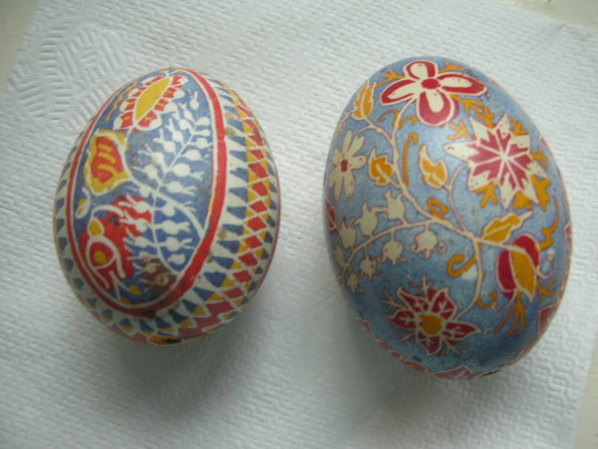 Těm ostatním, doufám, udělám radost. Běžným způsobem zdobení kraslic je tzv. vosková batika (kraslice v košíčku), kdy se na skořápku postupně nanáší vosk a vajíčko se barví žlutou a červenou, případně dvěma odstíny jedné barvy. Po nanesení poslední barvy se vosk opatrně stírá nahřátým hadříkem. K vzteku je, když díky nekvalitní skořápce poslední barva zflekatí a celá práce přijde vniveč. Vajíčka na obrázku jsme dělaly s dcerou.