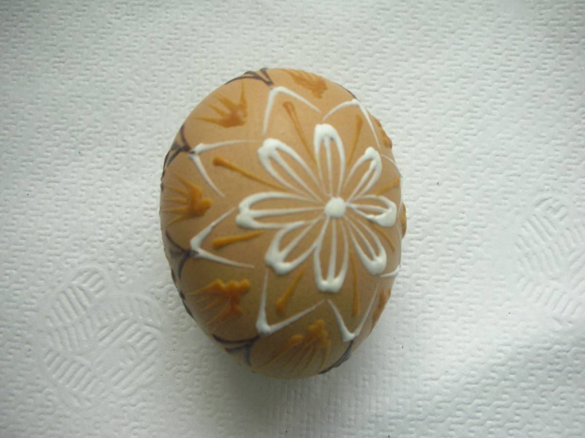 Hnědé vajíčko je zdobené tzv. voskovým reliefem. Barevný vosk se nanáší stejným způsobem jako u batiky, ale na skořápce zůstává.