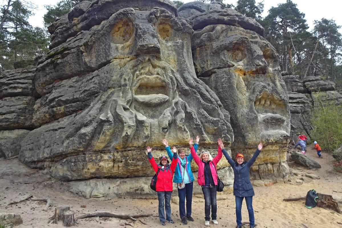 Holky, podívejte se nahoru... to byl povel a do holek jako když střelí. Vyškrábaly jsme se nahoru, jen pan řidič, který už tušil, kolik kilometrů kokořínskými lesy jsme při kufrování najeli, se dole usmíval pod vousy, jak nás pěkně zabavil. A měl pravdu. Musí ale snad být svatý, když vydržel to holčičí štěbetání bez konce. Paní, počkejte a neutíkejte, prosím vás, vyfoťte nás s čertovými hlavami. Ano prosím. Děkujeme.
