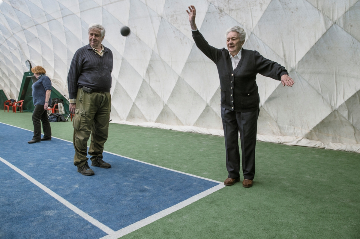 Pražská nafukovací hala kousek od kostela sv. Jakuba je cítit gumou, podrážkami a zatuchlinou desítek propocených triček tenistů, kteří tady trénují celou zimu. Povrch je pěkně rovný, ale po tenisových míčcích v něm zůstávají okem nespatřitelné nerovnosti, které pak dělají malé potíže při úplně jiné hře jménem pétanque. A o tu jde právě teď. Na hřišti stojí v kruhu asi patnáct hráčů, respektive hráček. Ženská převaha je drtivá. Probíhá rozcvička.