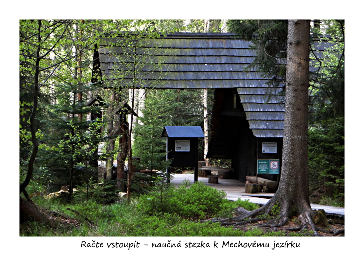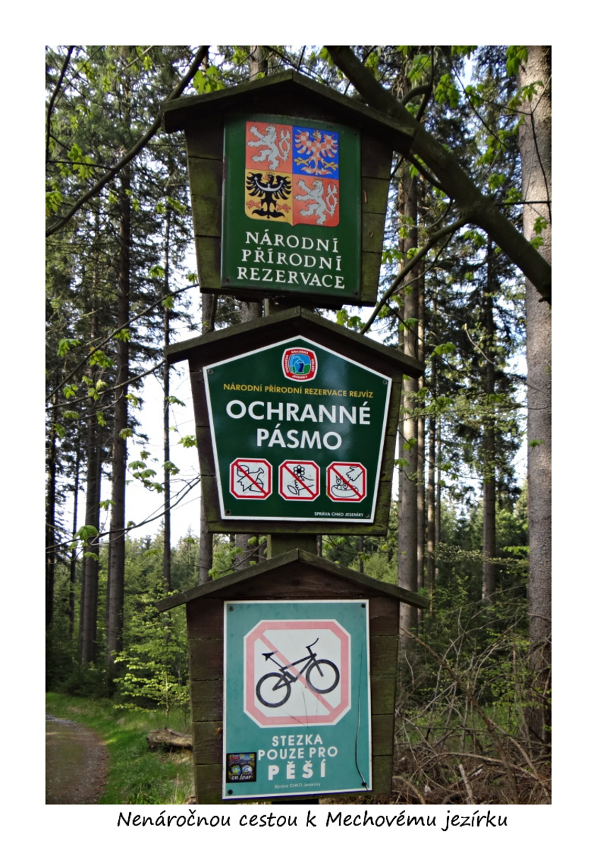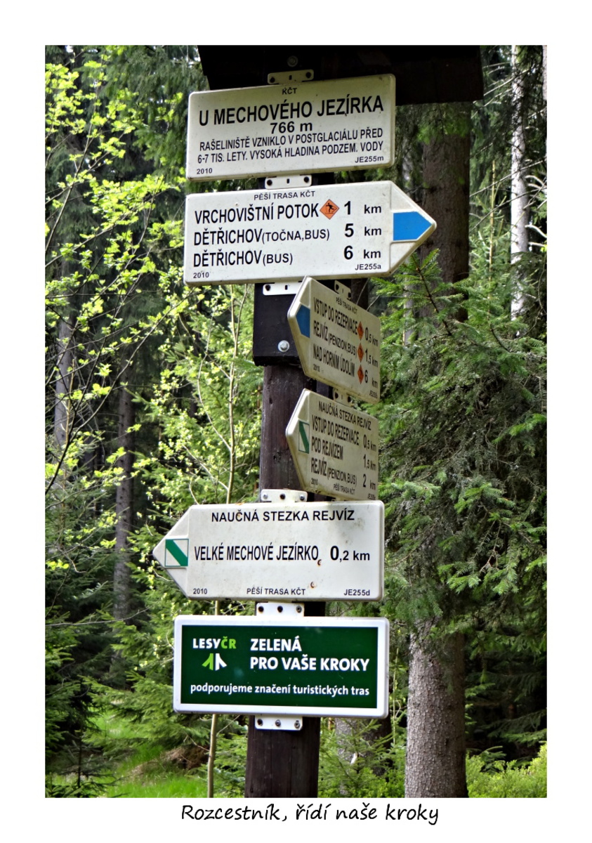 Trasu k Mechovému jezírku si můžete zvolit buď přímo od penzionu Rejvíz a nebo o kousek dál z rozcestí. Nezabloudíte, je tam ukazatel. Cesta z rozcestí je pohodlnější.