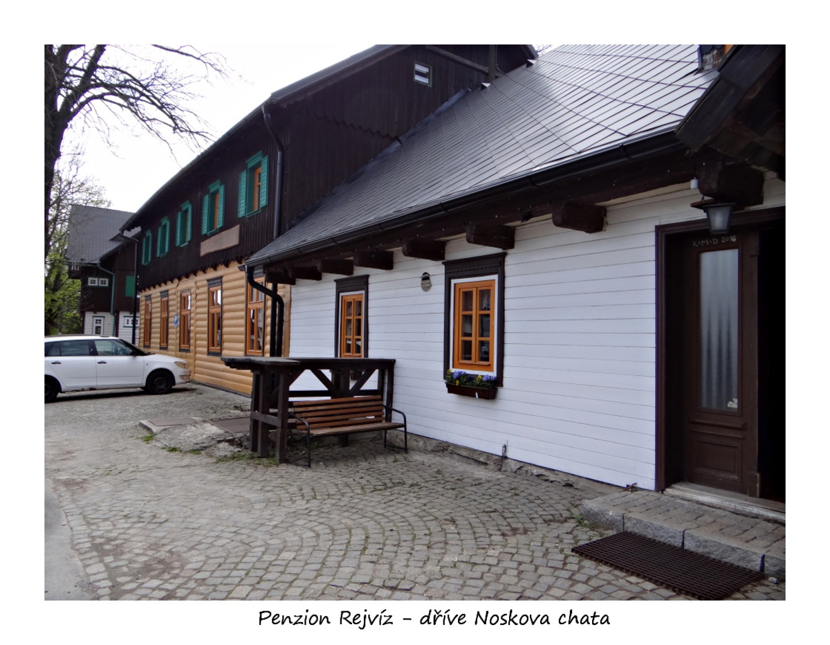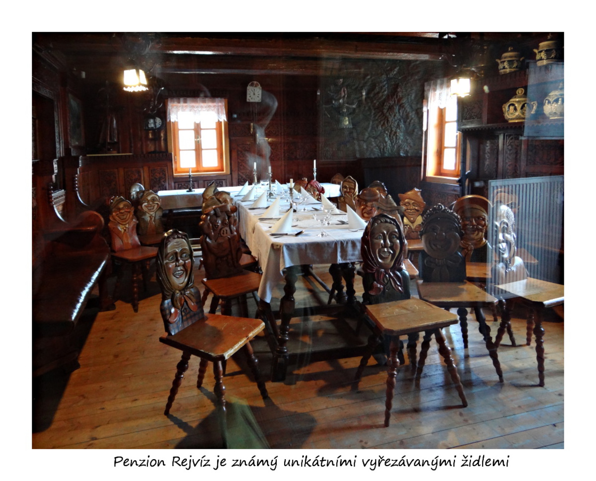 Zastavme se na chvíli ve zmíněném penzionu Rejvíz, kde se můžete nejen ubytovat, ale také stravovat. Pokud budete jen projíždět, i tak se zde určitě zastavte. Penzion Rejvíz se dříve jmenoval Noskova chata a je známý především historickými vyřezávanými židlemi.