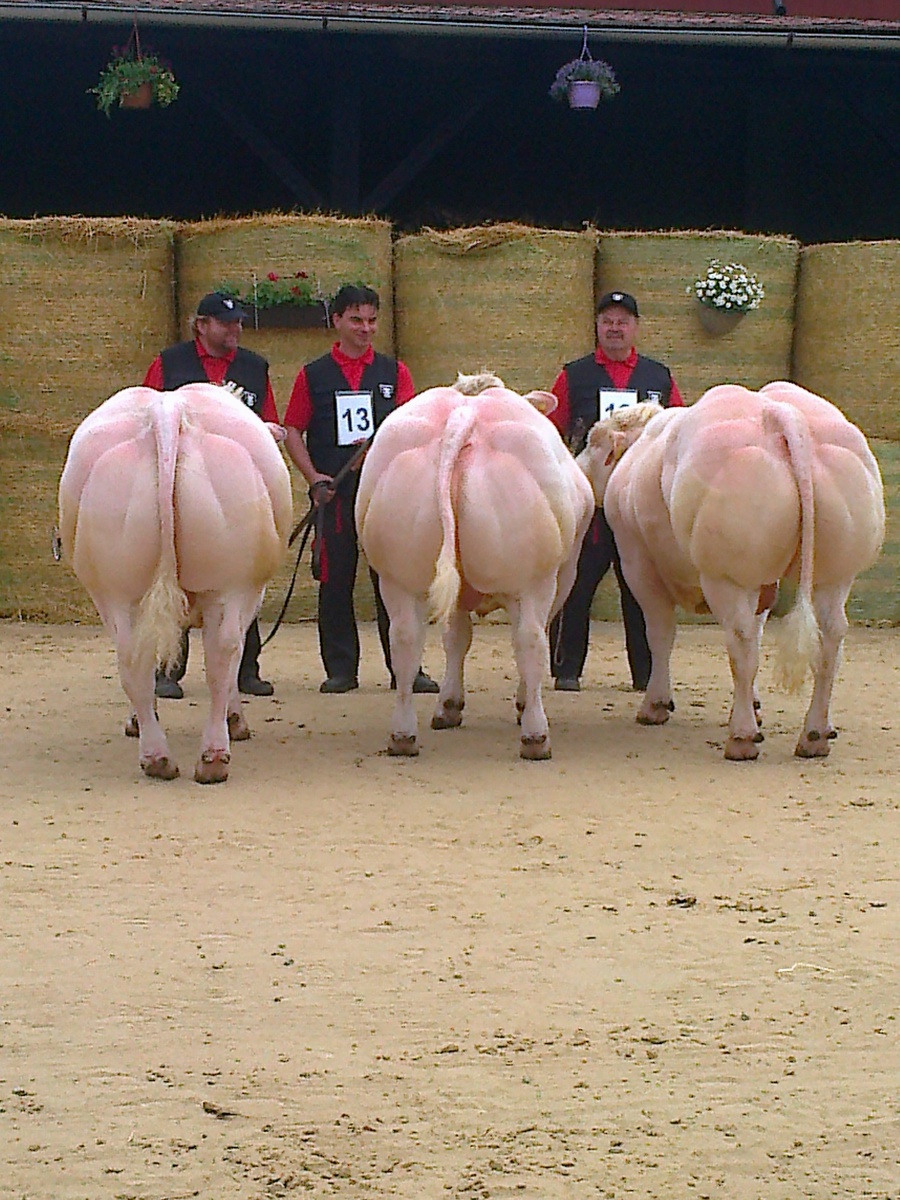 Největší pozornost všech přihlížejících vzbudili býci plemene belgické modro-bílé. Jedním slovem, jsou to hory masa. U nás se toto plemeno v čistokrevné formě chová minimálně. Příčinou jsou těžké porody, telata se přivádí na svět císařským řezem. Při křížení na krávy jiných plemen problémy s porody nejsou a telata v dospělosti dosahují kvalitního osvalení.