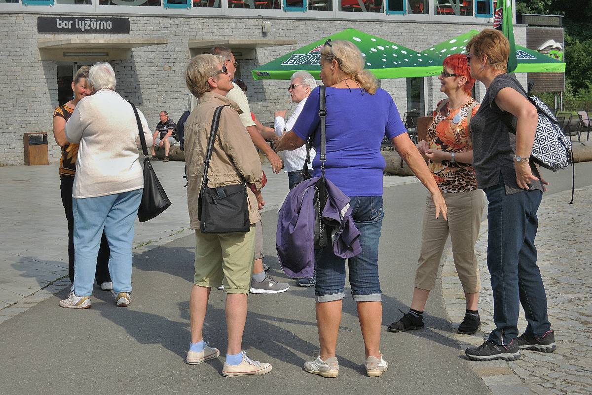 V 11.00 hodin jsme nasedli do autobusu, který nás zavezl do objektu elektrárny. V informačním centru nám průvodce vysvětlil princip elektrárny a zhlédli jsme dva filmy. Elektrárna se nachází na říčce Divoká Desná a je řešena jako podzemní dílo a má dolní a horní nádrž. V době přebytku energie v síti se voda přečerpá z dolní nádrže do horní, umístěné v nadmořské výšce 1350 m, a ve špičkách se v turbinovém režimu vyrábí elektrický proud. Výkon elektrárny je přenášen venkovním vedením v délce 52 km do rozvodny v Krasíkově. Po opuštění informačního centra jsme se prošli tunelem do prostoru, kde jsou umístěny dvě turbíny, a zpět k autobusu. Ten nás odvezl k dolní nádrži, kde byla krátká zastávka na fotografování. A potom jsme vyjeli k horní nádrži, kde byla půlhodinová přestávka. Někdo stihl obejít celou nádrž, někdo fotil, někdo se kochal pohledy na masiv Jeseníků s horou Praděd, někdo se posilňoval v bufetu. Průvodce nám nabídl možnost vrátit se do Koutů na koloběžce. Z naší skupiny tuto možnost nikdo nevyužil. A ještě jedna osobní poznámka. Mám radost, že žiji v zemi, kde máme neskutečně šikovné odborníky, kteří dokázali takto obrovské vodní dílo umístit do krásné přírody Jeseníků.