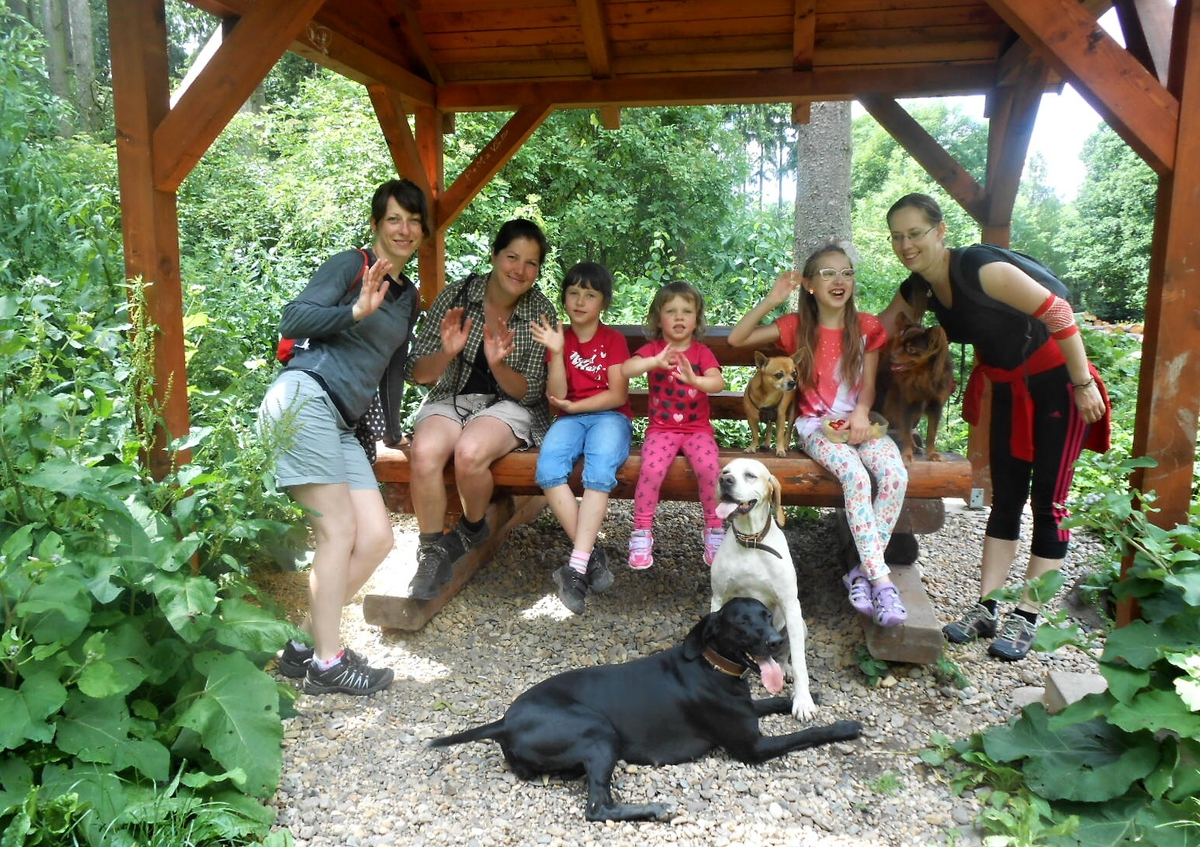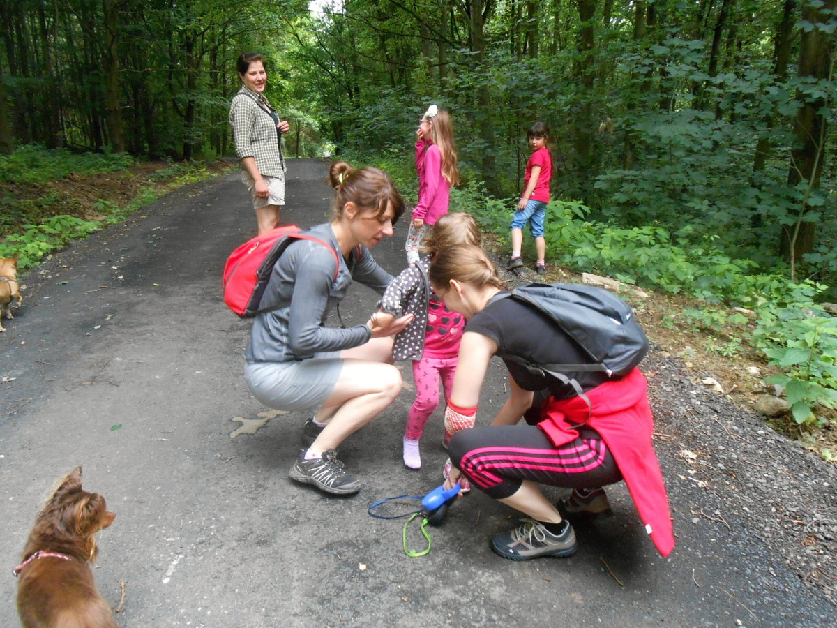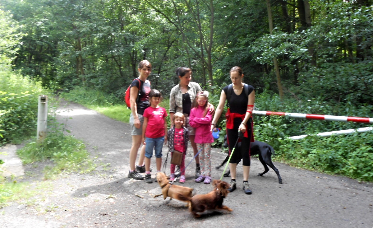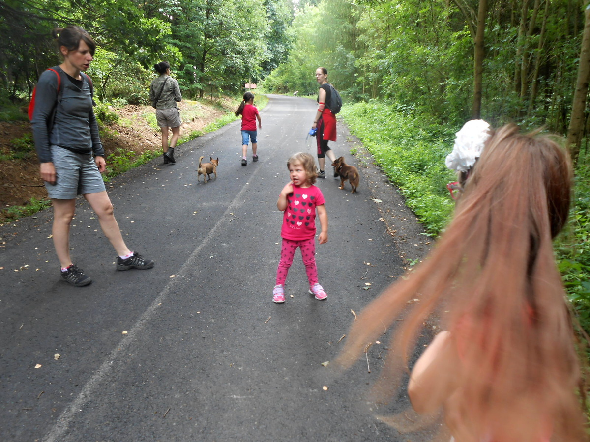 Košťálov je zřícenina hradu asi ze 14. století, přístupná veřejnosti. Stojí na vysoké čedičové skále nad Třebenicemi. Můžete jít po zelené turistické značce z Košťálova, nebo po červené asfaltkou (zákaz vjezdu) ze vsi Sutom. My jsme zvolili tu druhou trasu. Lesem se šlo opravdu krásně. Téměř rovinka vyhovovala mým starším nohám, psí holky lítaly po lese jedna radost a psí kluci se snažili jim nevlézt pod packy. Pro malé holčičky Vikču, Nelču a Aničku to byla také velká zábava. Všechny tři se dobře znají, takže žádný ostych se nekonal a cestu si užívaly děláním hloupostí. Mně smích trochu přešel, když jsme došli na konec silnice. Cesta k hradu totiž vedla do vrchu. Jak jinak, hrady a zejména zříceniny jsou téměř vždy na vysokém kopci. Nicméně jsem i tuto část zvládla a se supěním jak lokomotiva vyšplhala až nahoru.