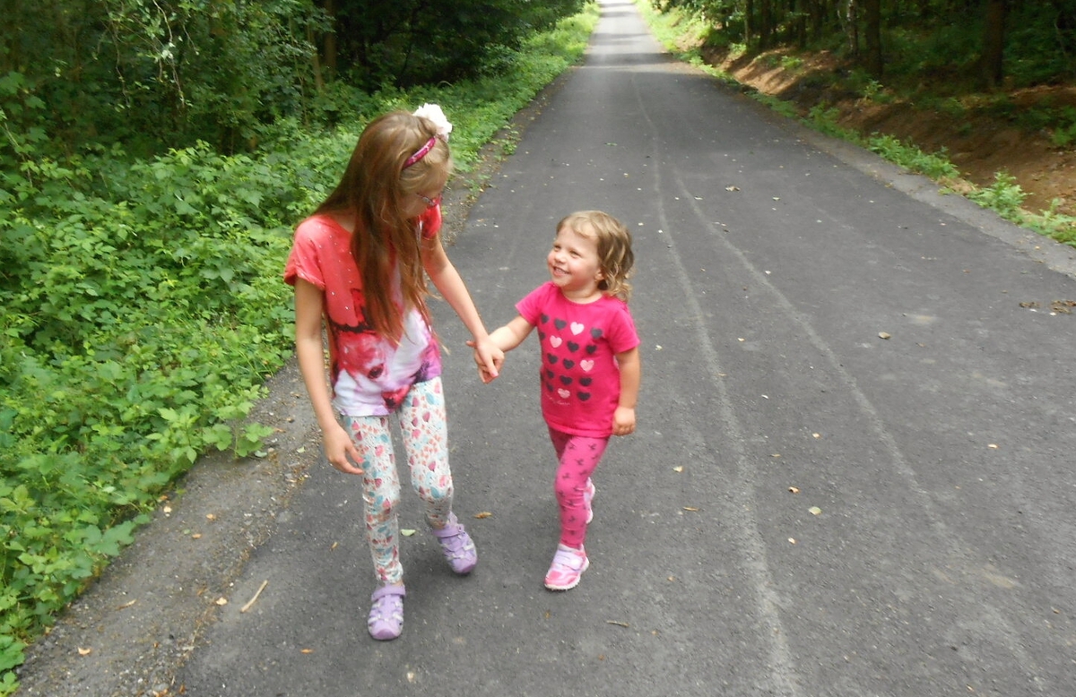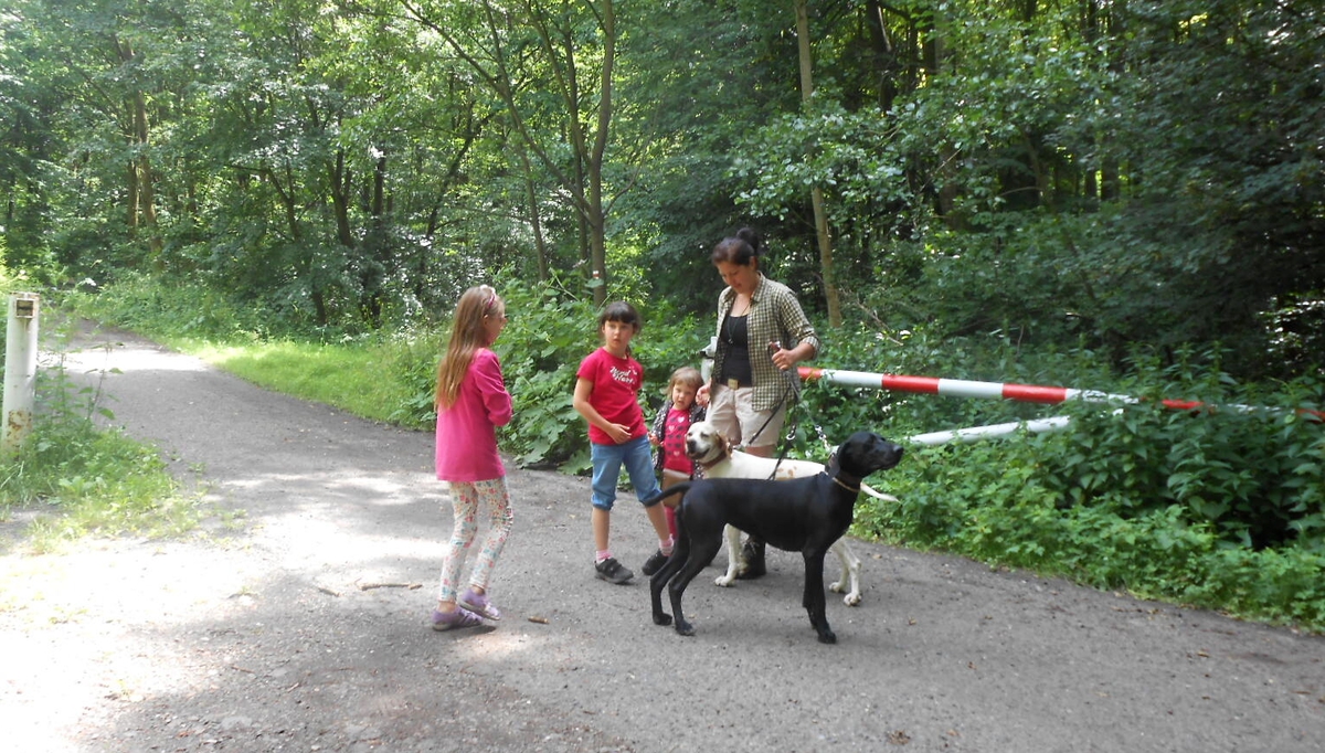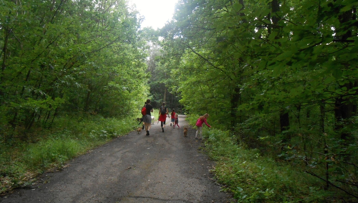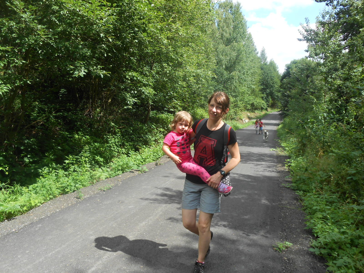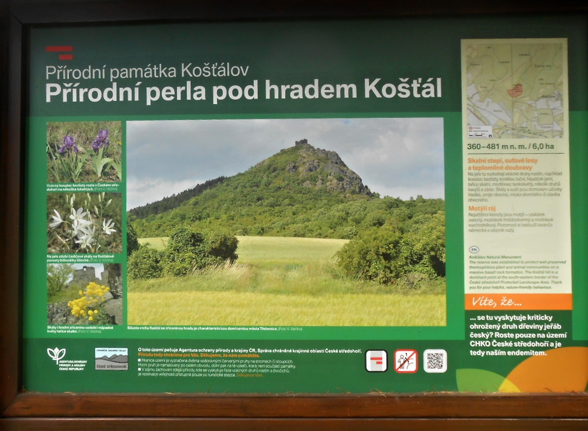 Košťálov je zřícenina hradu asi ze 14. století, přístupná veřejnosti. Stojí na vysoké čedičové skále nad Třebenicemi. Můžete jít po zelené turistické značce z Košťálova, nebo po červené asfaltkou (zákaz vjezdu) ze vsi Sutom. My jsme zvolili tu druhou trasu. Lesem se šlo opravdu krásně. Téměř rovinka vyhovovala mým starším nohám, psí holky lítaly po lese jedna radost a psí kluci se snažili jim nevlézt pod packy. Pro malé holčičky Vikču, Nelču a Aničku to byla také velká zábava. Všechny tři se dobře znají, takže žádný ostych se nekonal a cestu si užívaly děláním hloupostí. Mně smích trochu přešel, když jsme došli na konec silnice. Cesta k hradu totiž vedla do vrchu. Jak jinak, hrady a zejména zříceniny jsou téměř vždy na vysokém kopci. Nicméně jsem i tuto část zvládla a se supěním jak lokomotiva vyšplhala až nahoru.