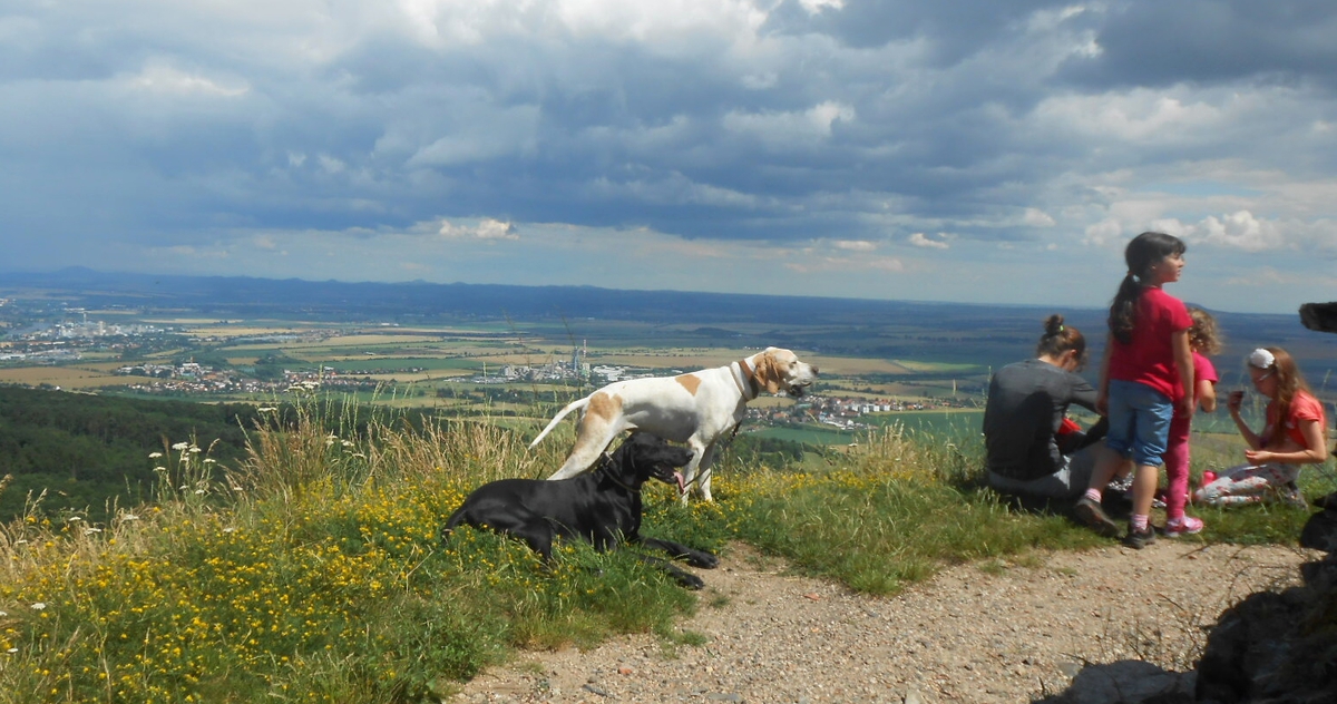 Na neděli 3.7. jsme si domluvily s dcerou výlet na zříceninu hradu Košťálov, který je součástí Českého středohoří a nachází se nedaleko Lovosic. Občas takhle jezdívám s dcerou, jejími kamarádkami, spoustou psů a několika dětmi. Tentokrát to opravdu byla skoro dámská jízda. Holky prostě byly v převaze. Skóre nám kazili naši dva pejsci Amíček a Boone. No řekněte sami. Jedna dáma v letech (moje maličkost), tři fešná děvčata, tři roztomilé holčičky 5-8 let, jedna z nich byla naše vnučka Anička, dvě feny loveckých psů (velké) a jako doplněk naši dva mrňouskové. Den byl na výlet jako stvořený. Slunce svítilo, nebylo moc vedro, i když se mraky docela rojily, jak je vidět na fotkách. Nasedli jsme všichni do aut a vydali se na cestu.